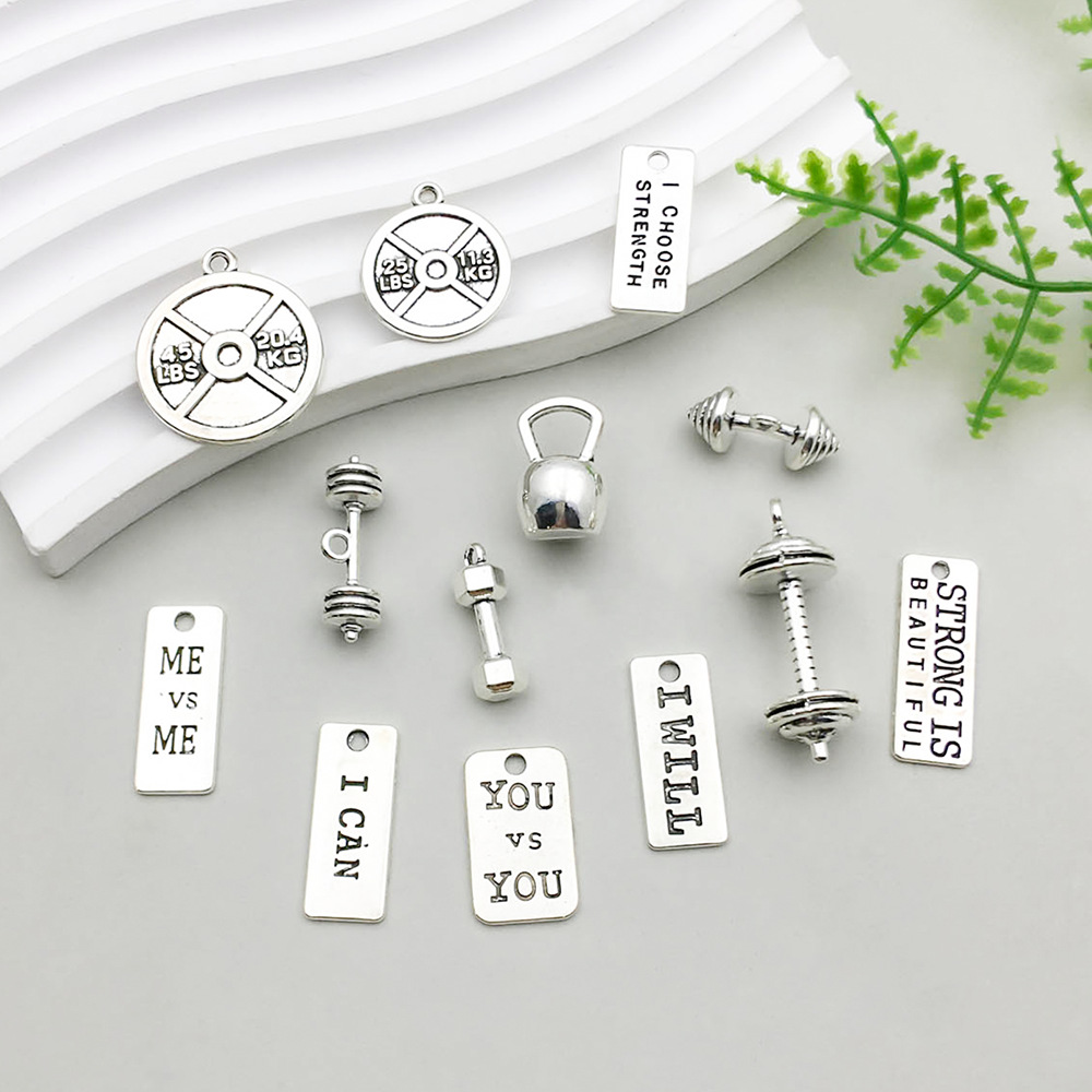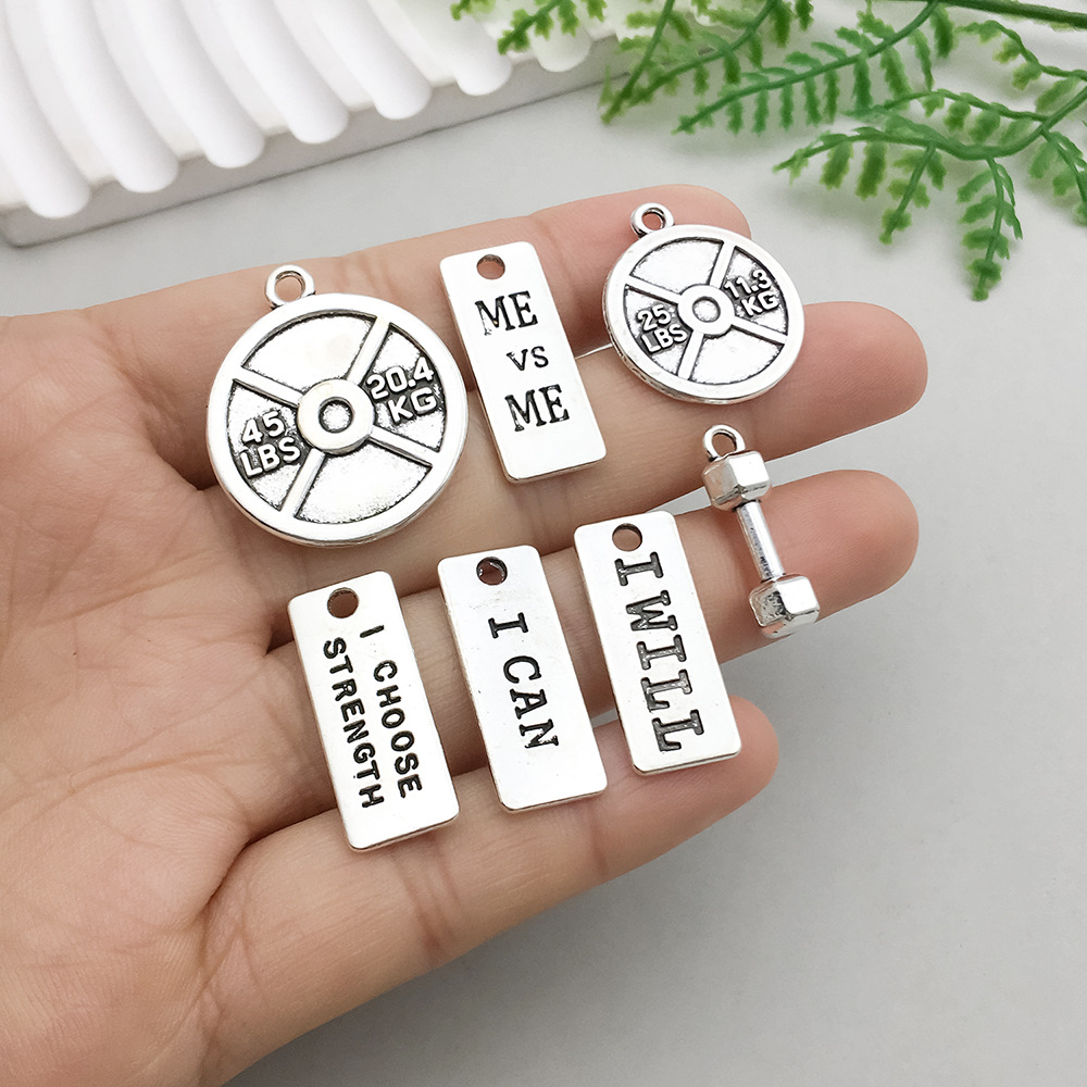 1:Mix 13pcs Ancient Silver Sports Equipment suit -37.7 g-SN642:1 ancient silver MEVSME letter card 10*24mm-2g-89923:1 ancient silver ICHOOSESTRENGTH letter card 10*24mm-2.1g-89974:1 ancient silver square YOUvsyou letter card 13*22mm-2.4g-89995:1 ancient silver ICAN letter card 10*25mm-1.9g-90026:1 ancient silver IWILL letter card 9*25mm-1.8g-90047:1 ancient silver strong letter card 10*27mm-1.7g-90068:1 ancient silver sports equipment barbell 6*20mm-2g-90089:1 ancient silver sports barbell card 20*23mm-1.8g-900910:1 ancient silver sports equipment dumbbell 11*18mm-6.5g-901011:1 ancient silver sports equipment barbell 12*34mm-6g-901112:1 ancient silver sports equipment dumbbell 8*25mm-2.7g-901413:1 ancient silver sports equipment bending bow dumbbell 10*20mm-2.7g-901514:1 ancient silver zinc alloy round barbell 24*27mm-3.4g-15768