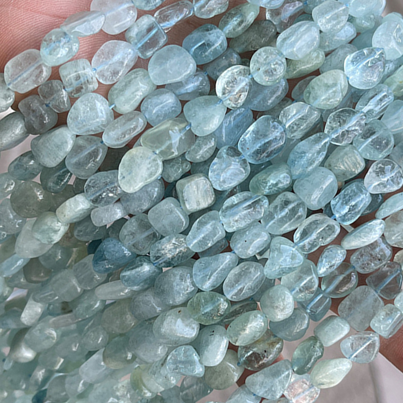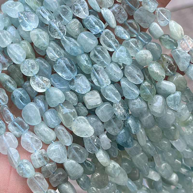 Perles bijoux en pierres gemmes, aigue-marine, pepite, poli, DIY, bleu, beads size 8-10mm, Environ 35PC/brin, Vendu par brin