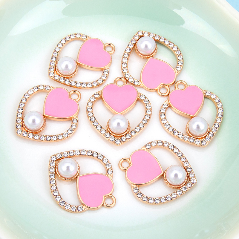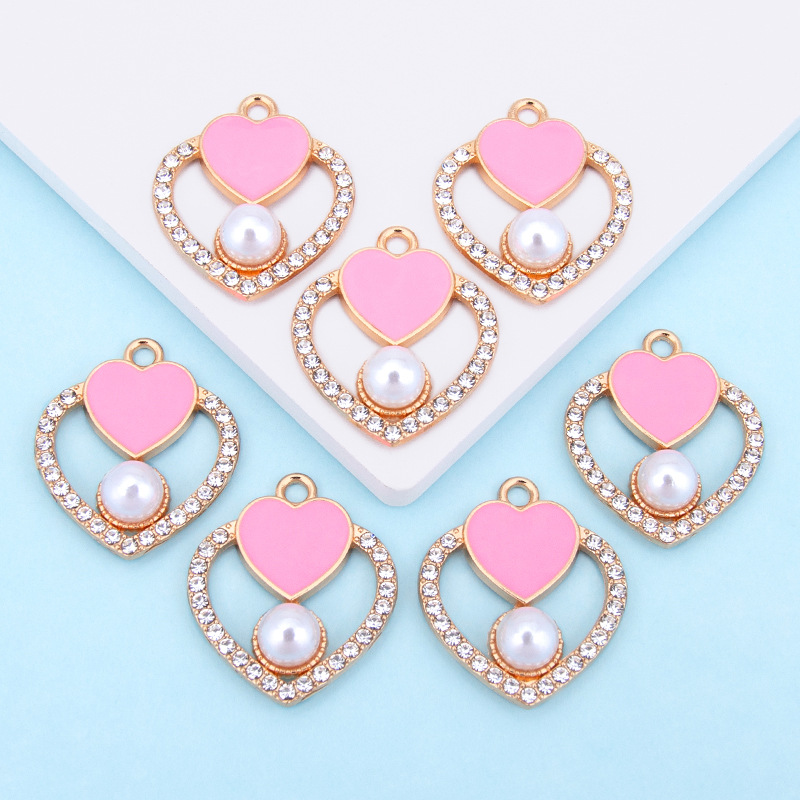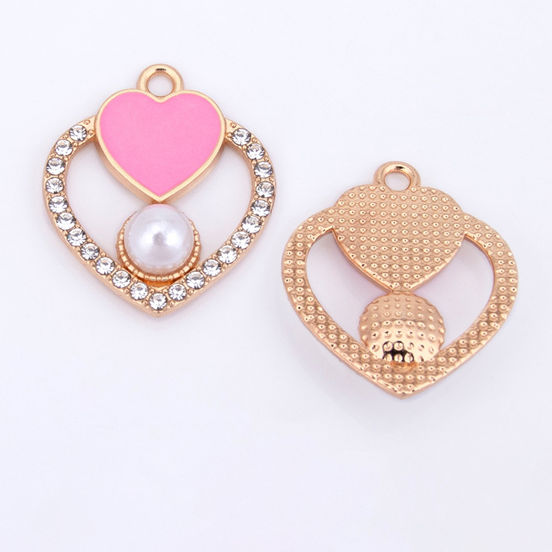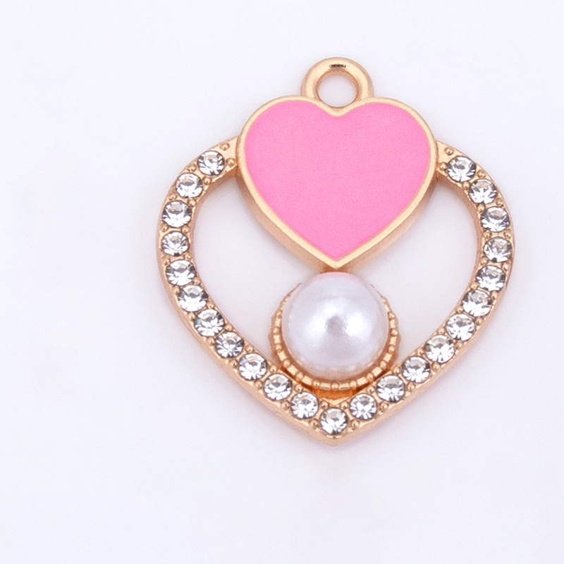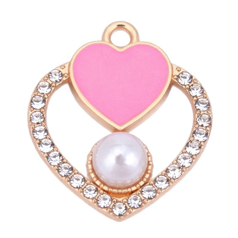 Zinc Alloy émail Pendants, alliage de zinc, avec perle de plastique, coeur, Placage, DIY & pavé de micro zircon, rose, 20x24mm, Vendu par PC