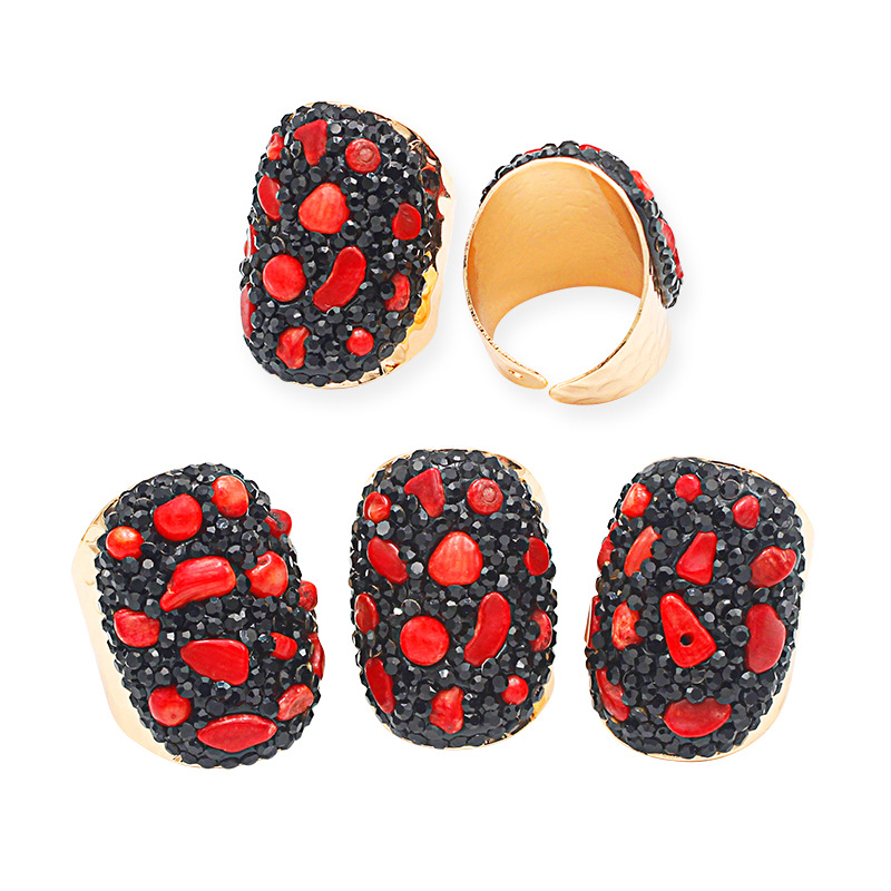 laiton Cuff Bague, avec corail synthétique, Placage de couleur d'or, pour femme & avec strass, noire, protéger l'environnement, sans nickel, plomb et cadmium, inner diameter:17~20mm, Vendu par PC