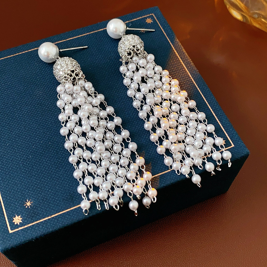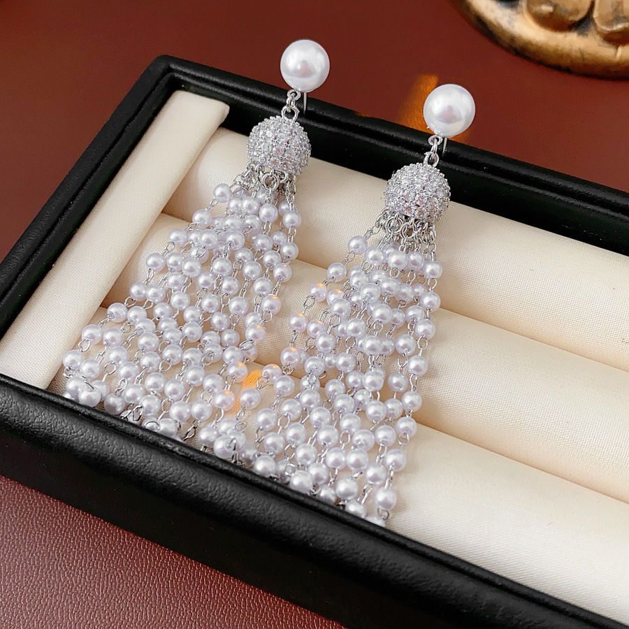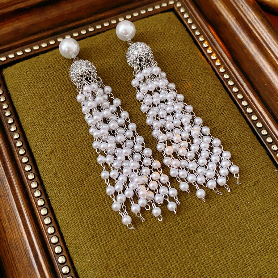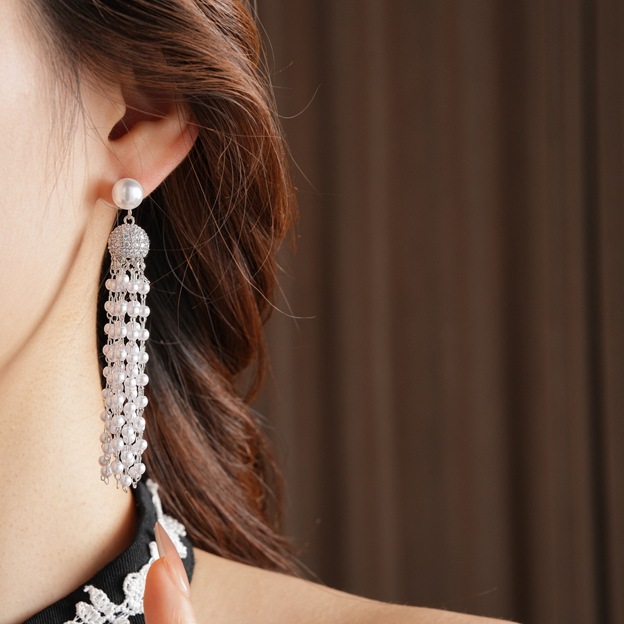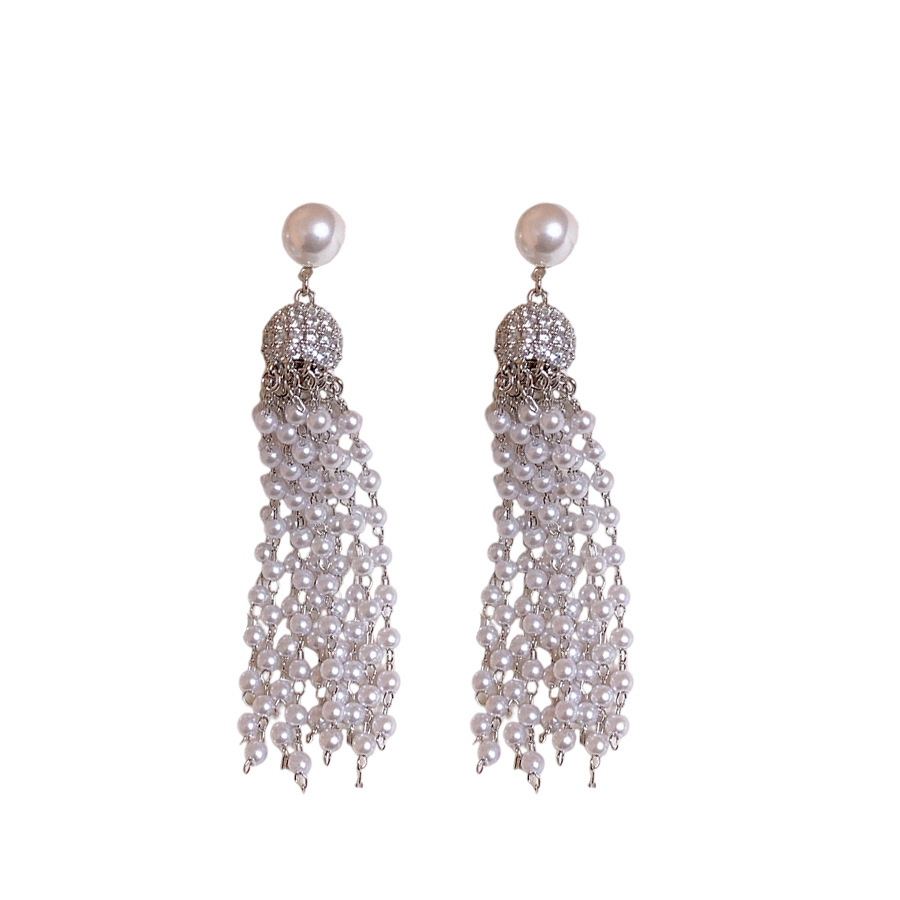 laiton boucle d'oreille en gland, avec perle de plastique, Placage de couleur argentée, pavé de micro zircon & pour femme, 15x75mm, Vendu par paire