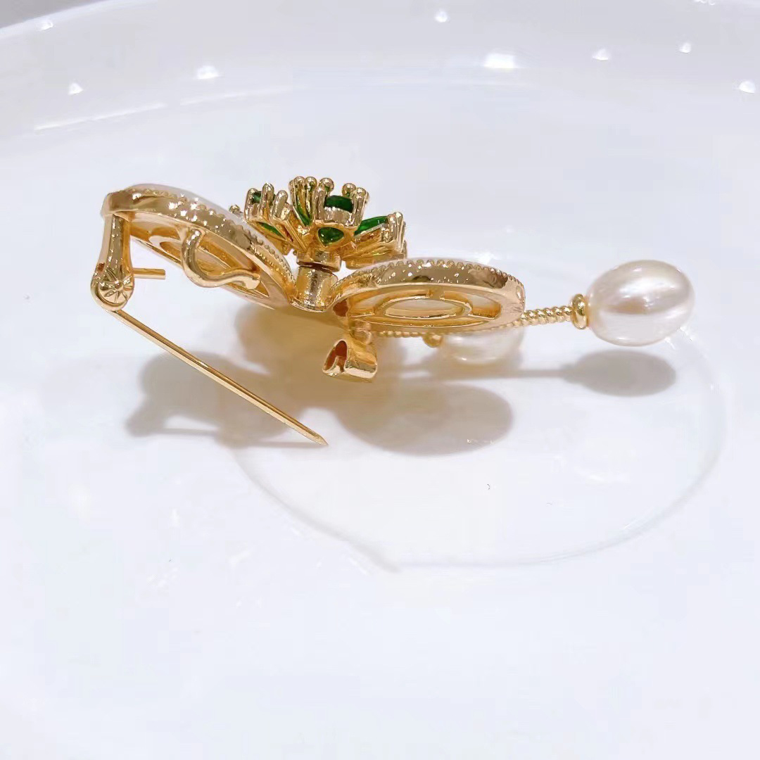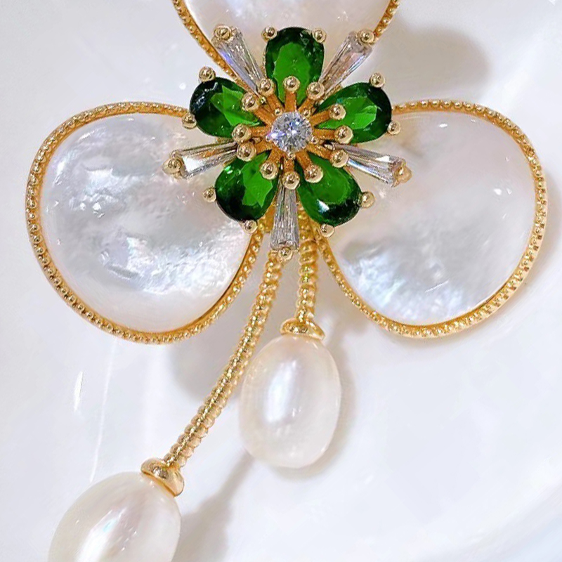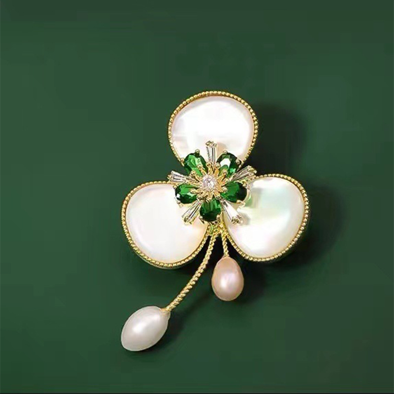 laiton broche, avec coquille blanche & perle de verre, Trois Clover Leaf, Placage de couleur d'or, pour femme & avec strass, brooch length 35-55mm, Vendu par PC