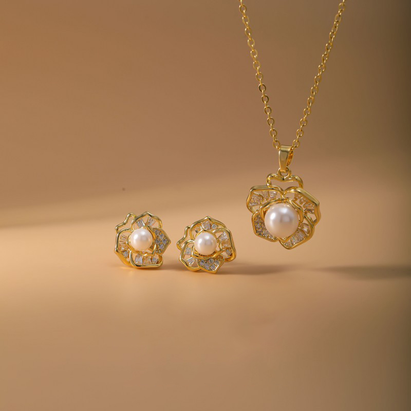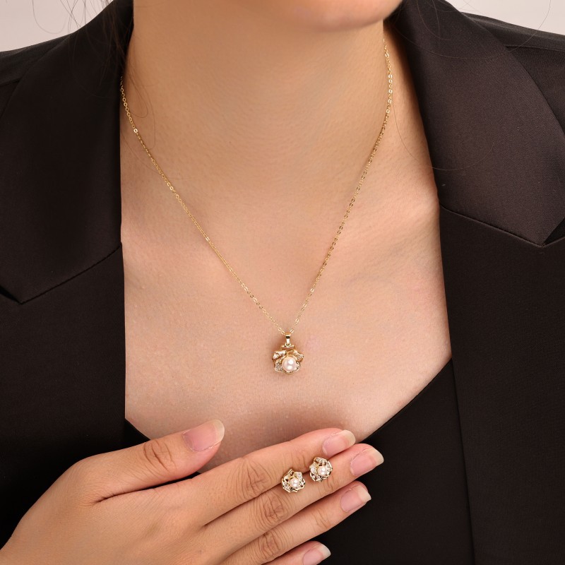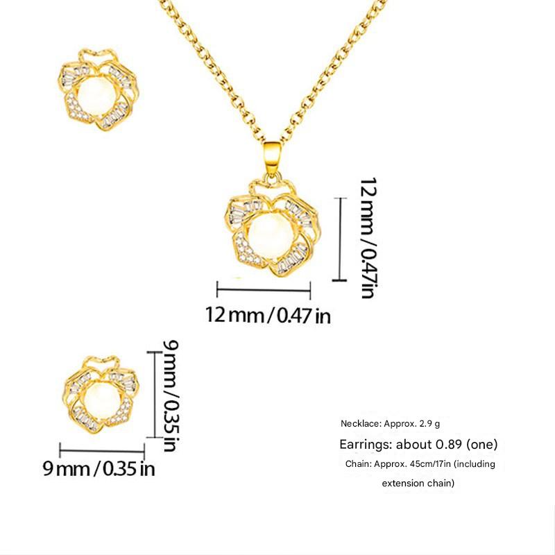 laiton parure de bijoux, Boucle d’oreille stud & collier, avec perle de plastique, fleur, Placage, 2 pièces & pavé de micro zircon & pour femme, Or, Vendu par fixé