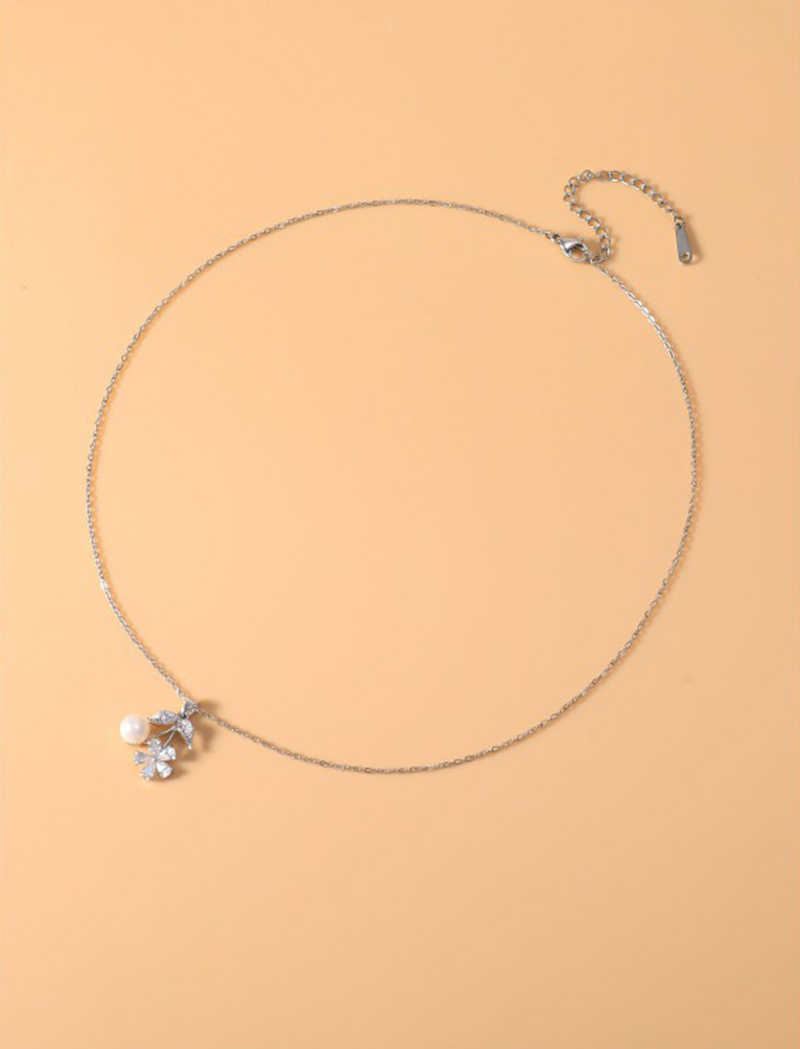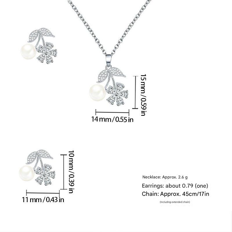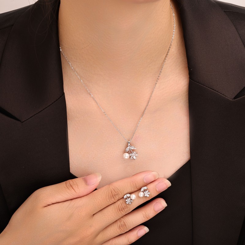 laiton parure de bijoux, Boucle d’oreille stud & collier, avec perle de plastique, fleur, Placage, 2 pièces & pavé de micro zircon & pour femme, argent, Vendu par fixé