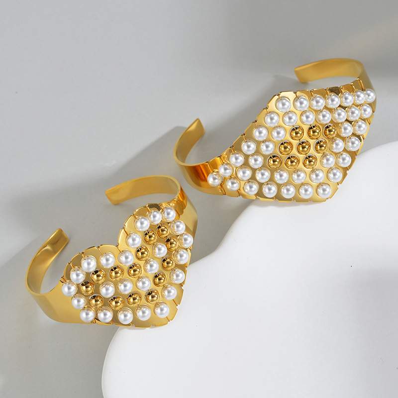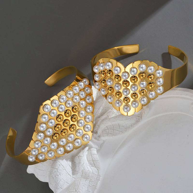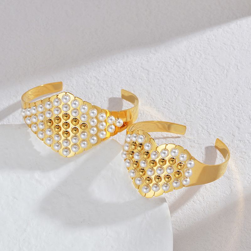 304 Cruach dhosmálta Chufa Bangle, le Pearl Plaisteacha, plátáilte, jewelry faisin & stíleanna éagsúla do rogha & do bhean, órga, Díolta De réir PC