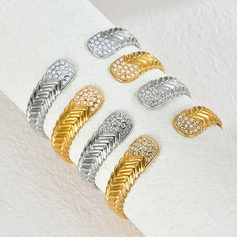 304 Cruach dhosmálta Chufa Bangle, le Pearl Plaisteacha, plátáilte, ábhair éagsúla do rogha & micrea réiteach zirconia ciúbach & do bhean, dathanna níos mó le haghaidh rogha, Díolta De réir PC