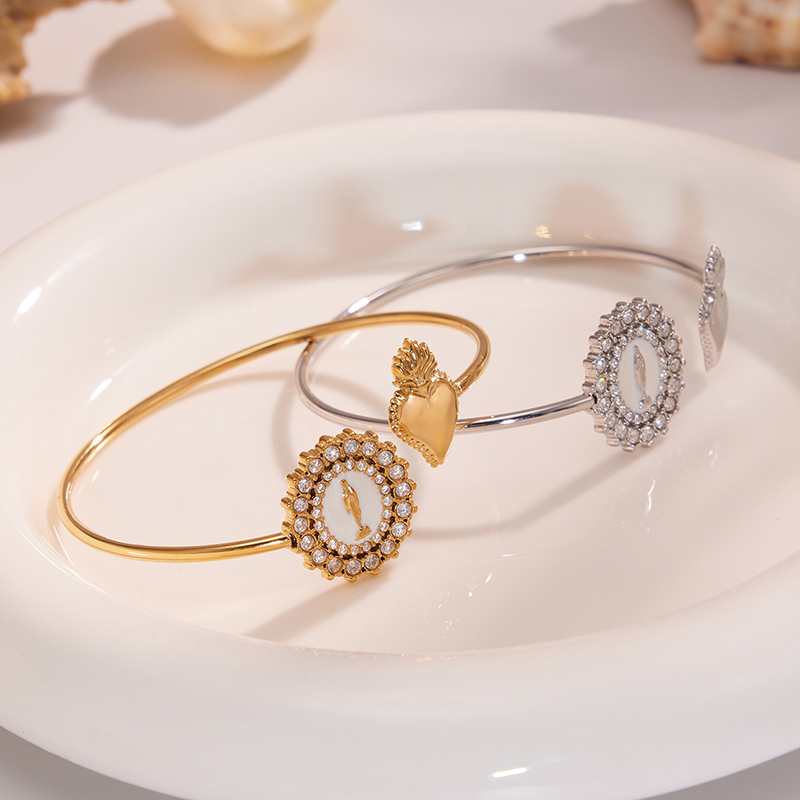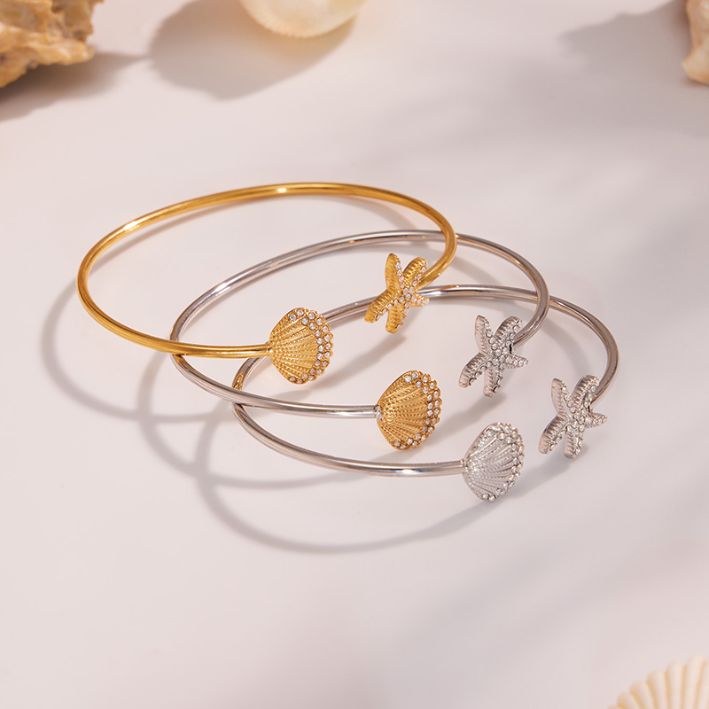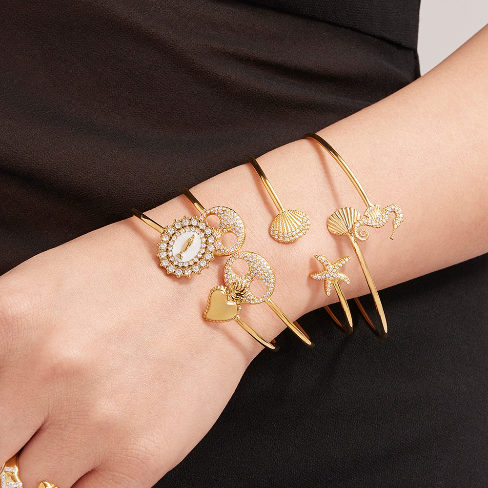 1:Golden seahorse shell open bracelet2:Golden pig nose opening bracelet3:Golden starfish shell bracelet4:Steel-colored starfish shell bracelet5:Intergold starfish shell bracelet6:Golden zircon heart bracelet full of diamonds7:Steel-colored full diamond zircon heart bracelet