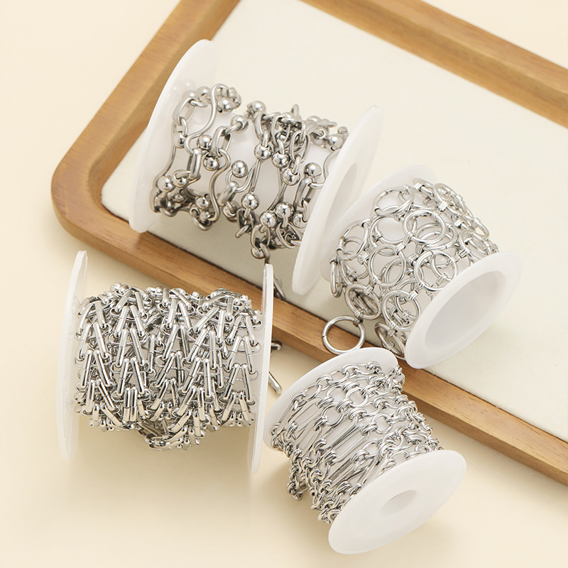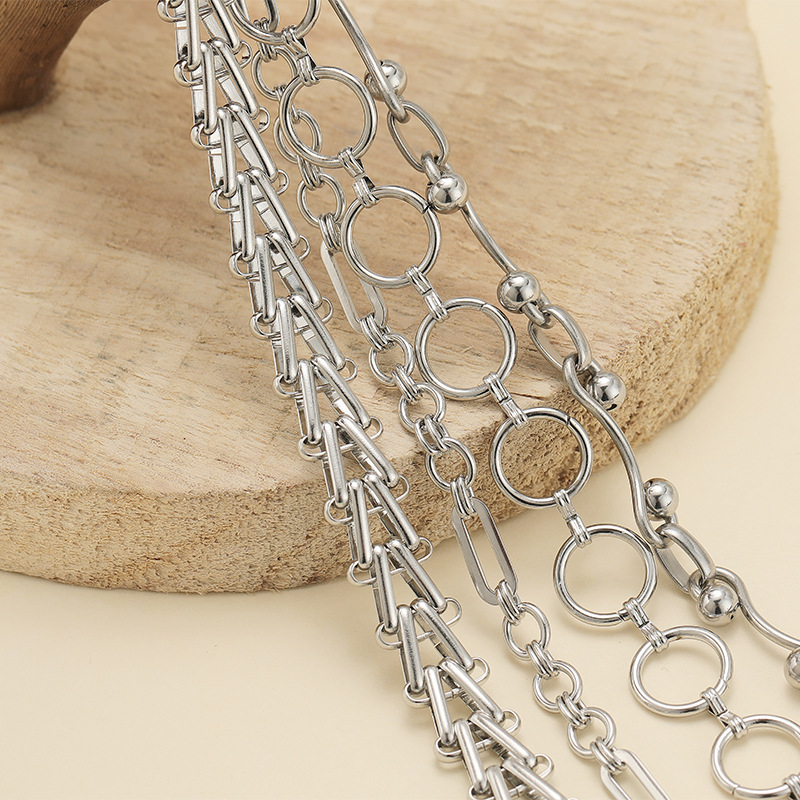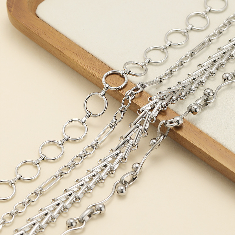 1:1x14mm circle + 3-word buckle hand chain2:1.7mm wire diameter 14x29mm w+6mm double beads handmade chain3:12mm wide 4.5mm thick stair chain handmade chain4:7mm wide handmade chain 4 double layers + 6x15mm oval buckles