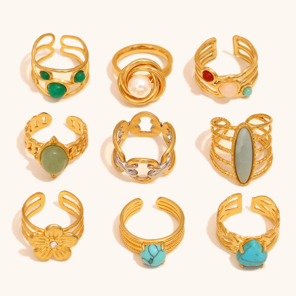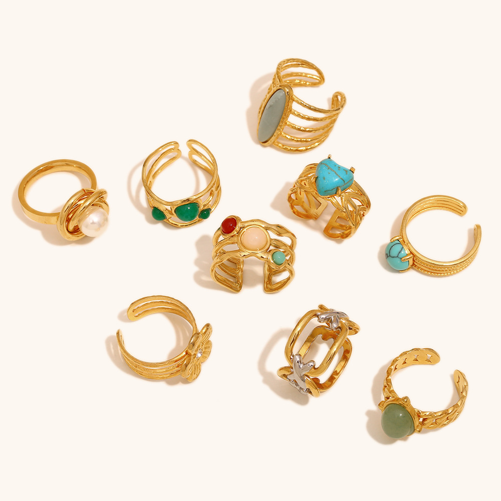 1:Flower open ring-gold2:Green aventurine chain open ring-gold3:Double layer multi-color gemstone open ring-gold4:Blue turquoise love open ring-gold5:Semi-circle turquoise stud earrings-gold6:Emerald open ring-gold7:Wrap pearl ring-gold-size 68:Wrap pearl ring-gold-size 79:Wrap pearl ring-gold-size 810:Long gemstone open ring-gold