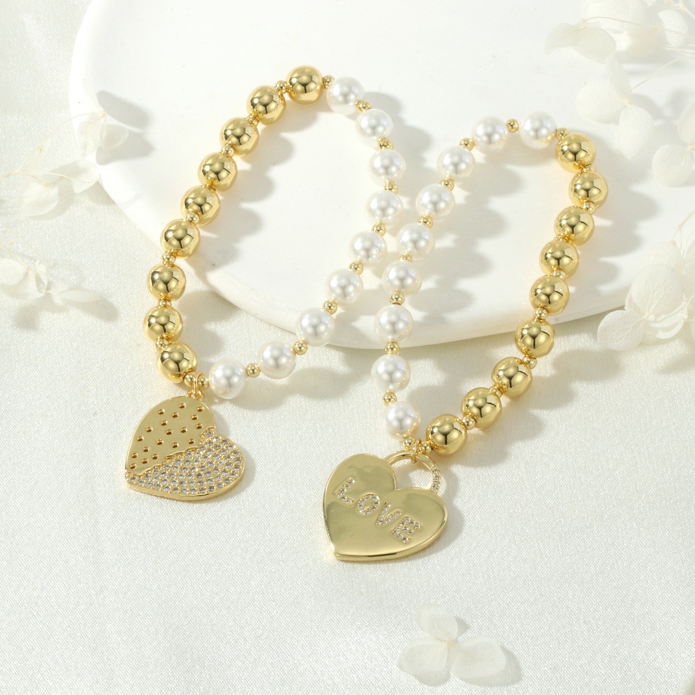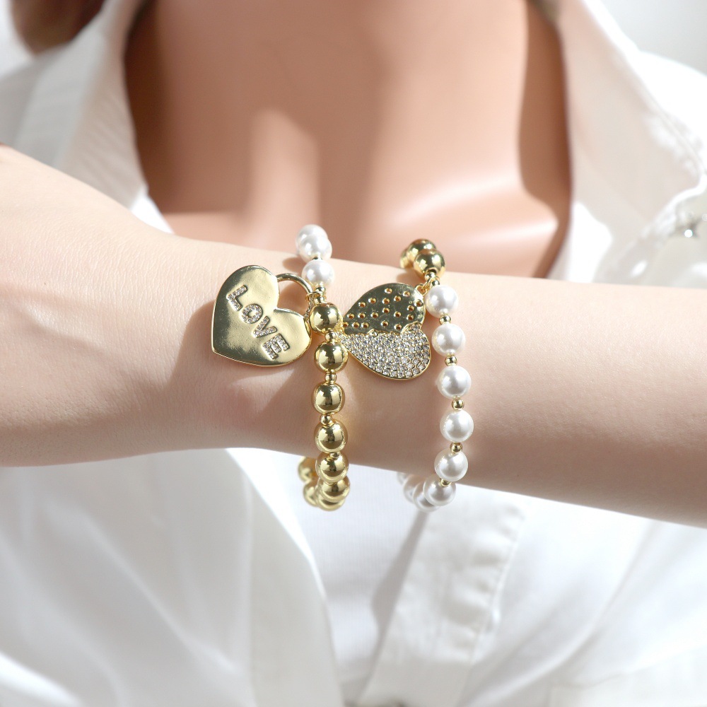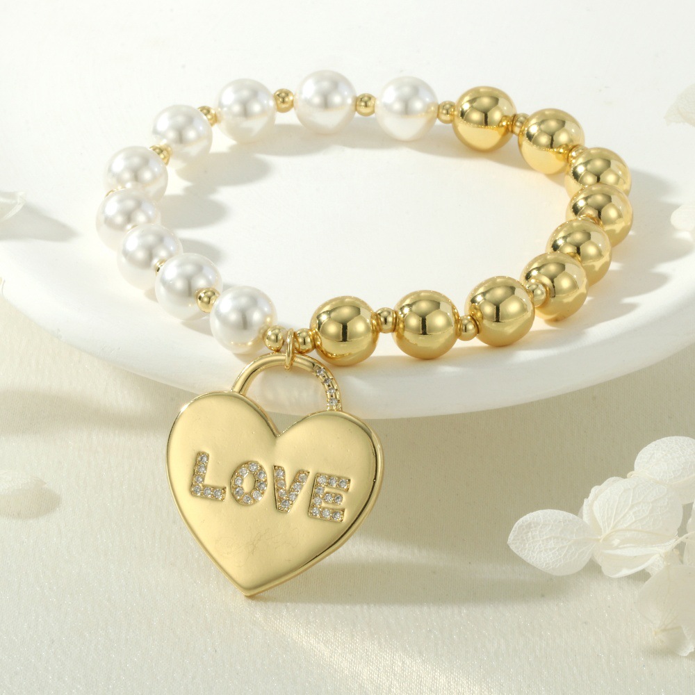 Ciúbach Zirconia Micrimhilseogra réiteodh Bracelet Prás, le Shell Pearl & Ciúbach Zirconia & Leaisteacha Snáithe, Croí, dath an óir plated, do bhean, nicil, luaidhe & caidmiam saor in aisce, Fad 16-17 cm, Díolta De réir PC