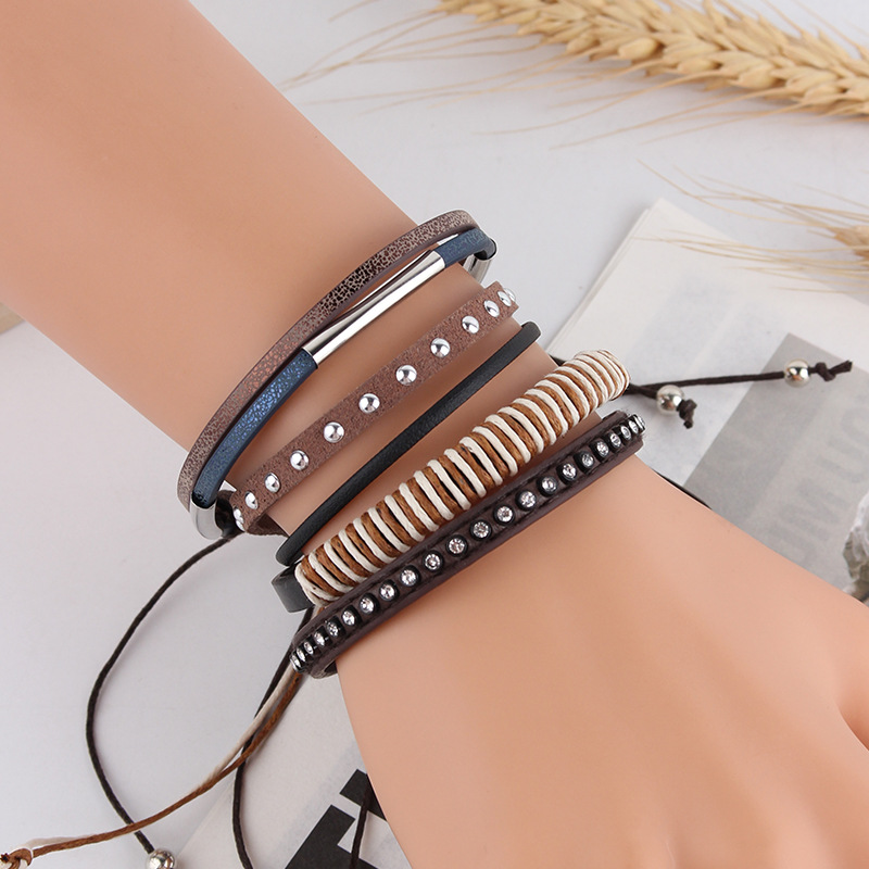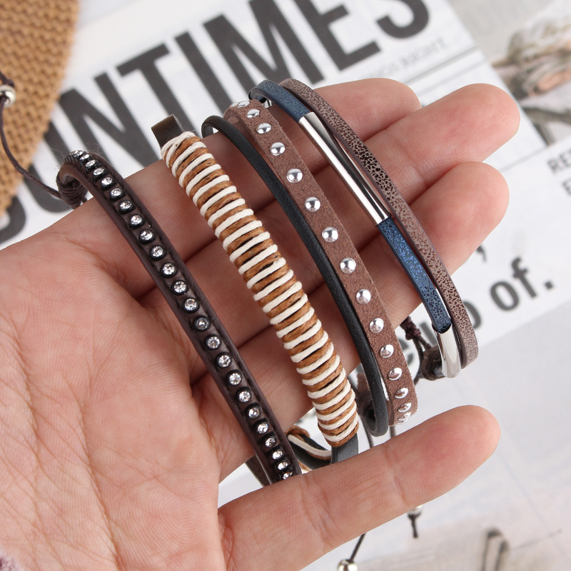 1:Korean velvet bracelet with rivets2:Wax Line Leather Bracelet3:Double Leather Bracelet4:Rhinestone leather bracelet5:4 Piece Set