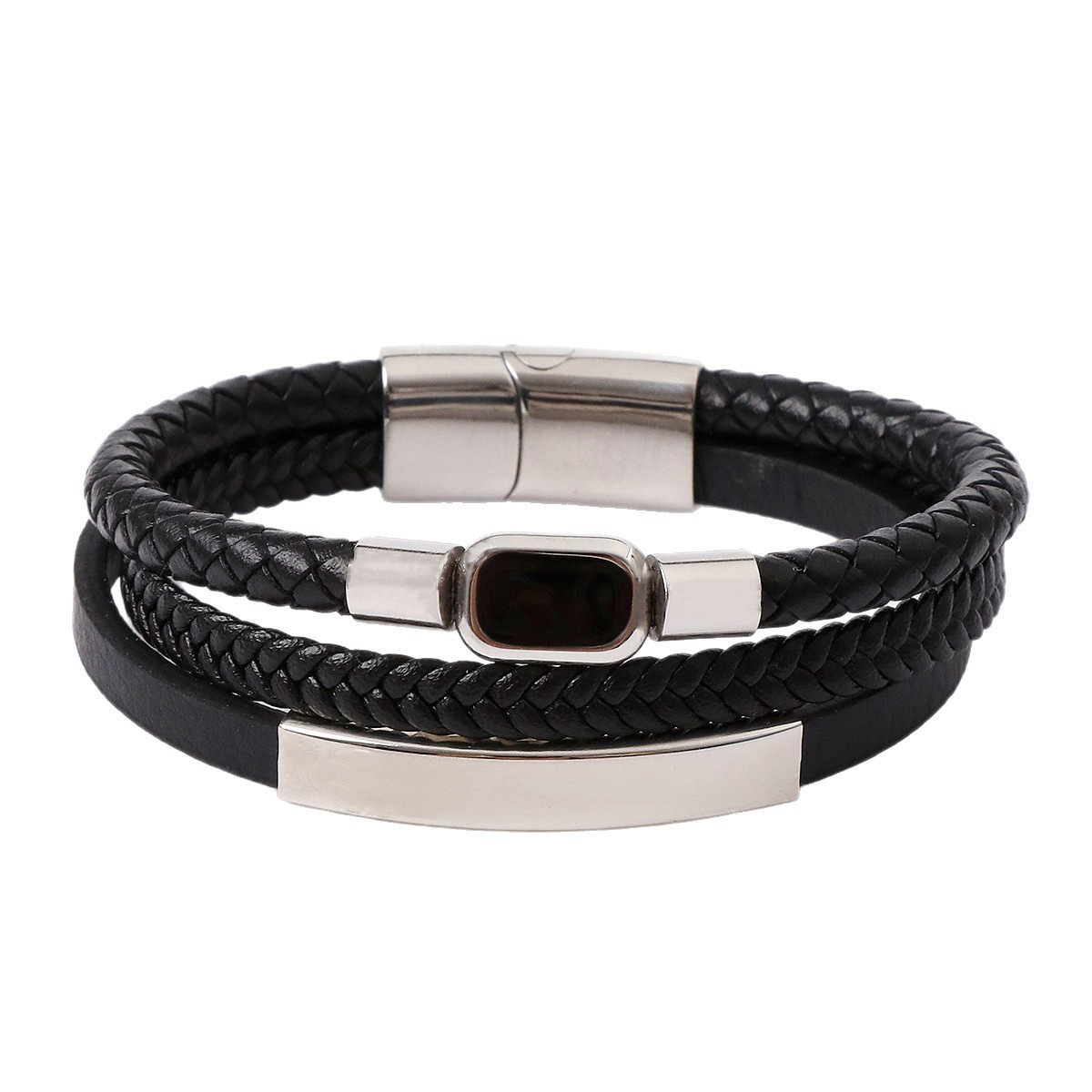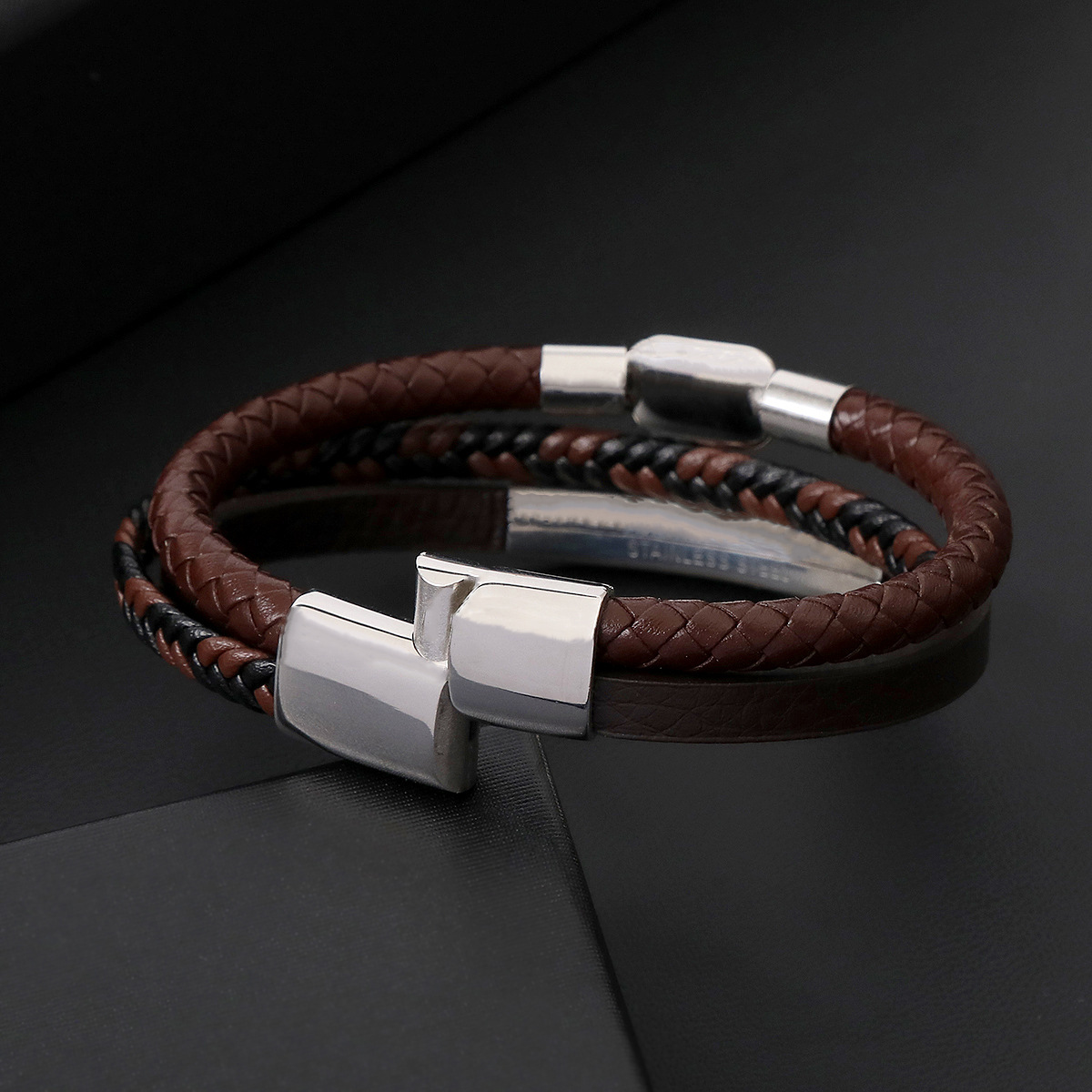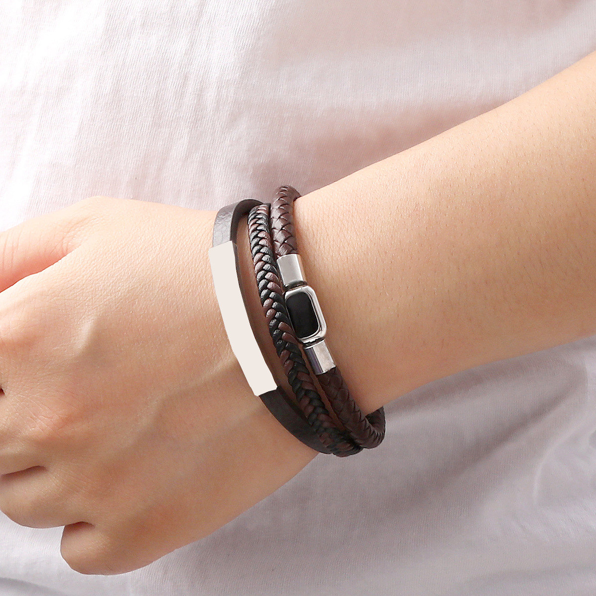 Bráisléid Corda PU, 304 Cruach dhosmálta, le PU Microfiber & Cowhide & 316 Cruach dhosmálta, lámhdhéanta, trí shraith & do fear & cruan, dathanna níos mó le haghaidh rogha, Fad 21 cm, Díolta De réir PC