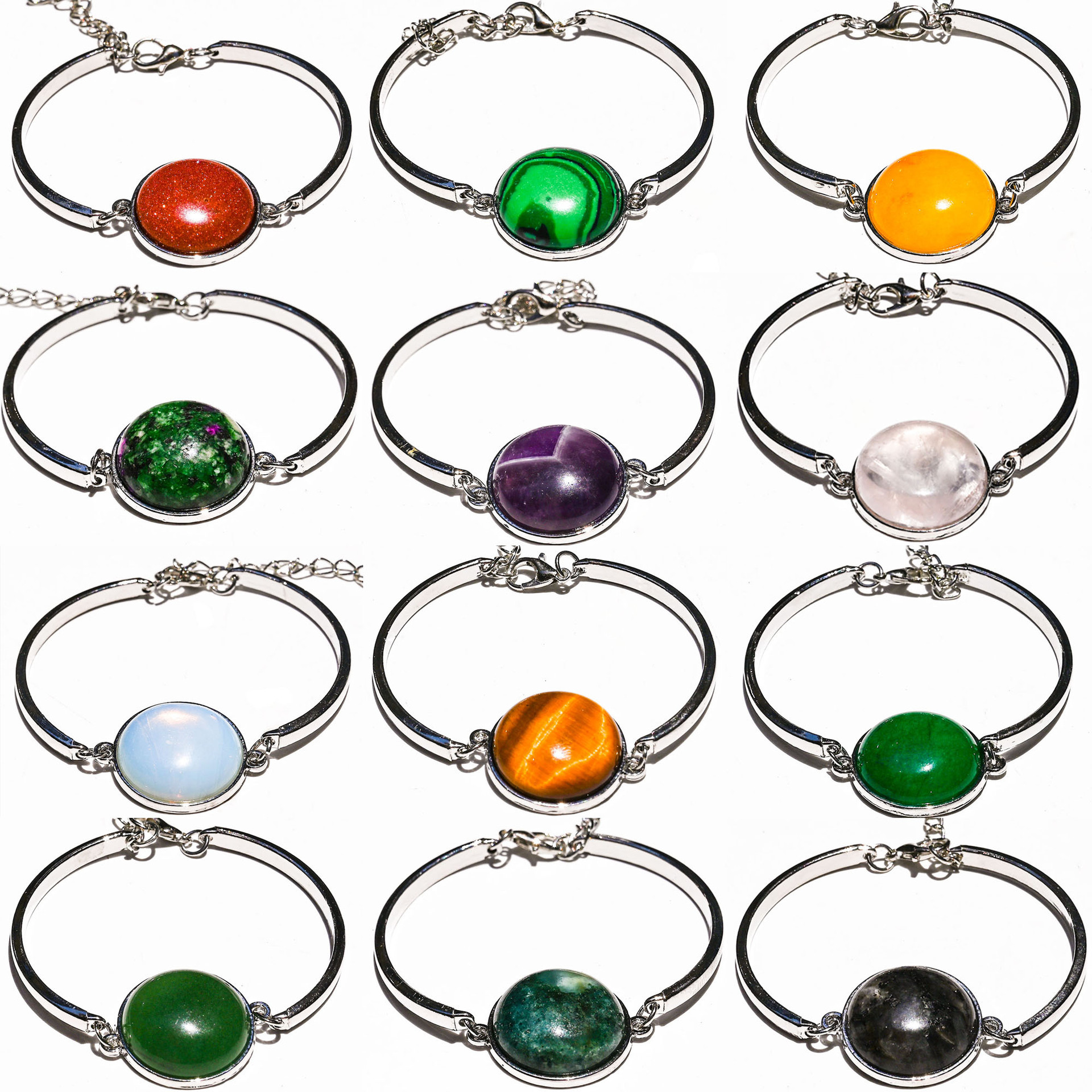 1:Amethyst2:Malachite (synthetic)3:Florite4:Goldstone (synthetic)5:Snowflake (synthetic)6:Jade Malaysia7:Chalcedony8:Ruby in Zoisite9:Rose Quartz10:Green Aventurine11:tiger eye12:Opal (synthetic)13:Black Labradorite14:Indian agate