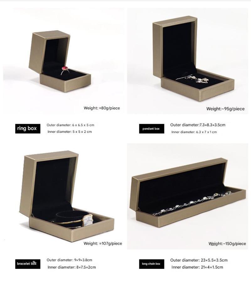 ring box 6*6.5*5.3cmpendant box 7.3*8.3*3.5cmbangle box 9*9*3.8cmnecklace box 22*5.5*3.3cmgift bag 13.5*18.5*6.5cm