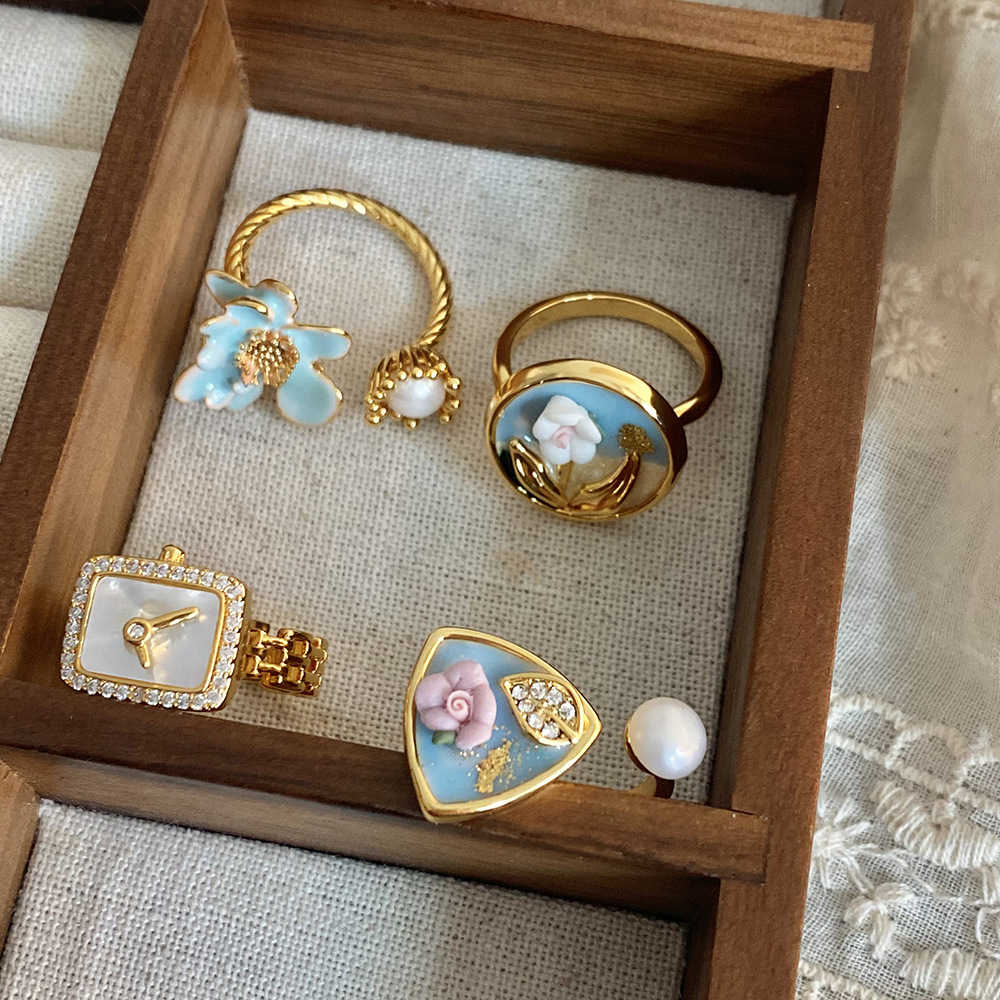 1:18K gold [round white flower]]2:18K gold [blue flower]]3:18K gold [blue purple flowers]]4:18K gold [shell]]