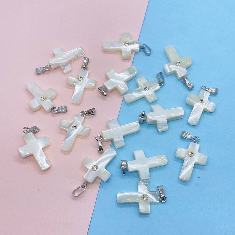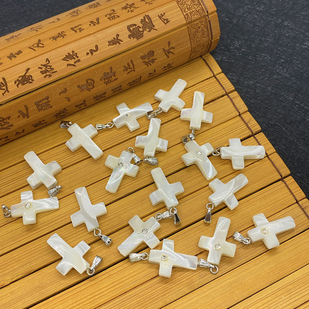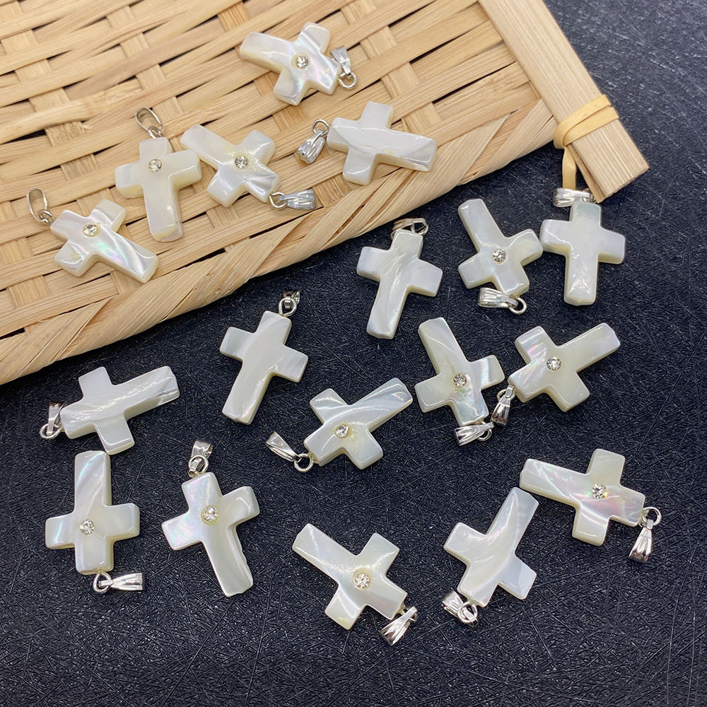 Pendants White Shell Nádúrtha, Cross, DIY & stíleanna éagsúla do rogha & le rhinestone, dathanna níos mó le haghaidh rogha, 15x24mm, Díolta De réir PC