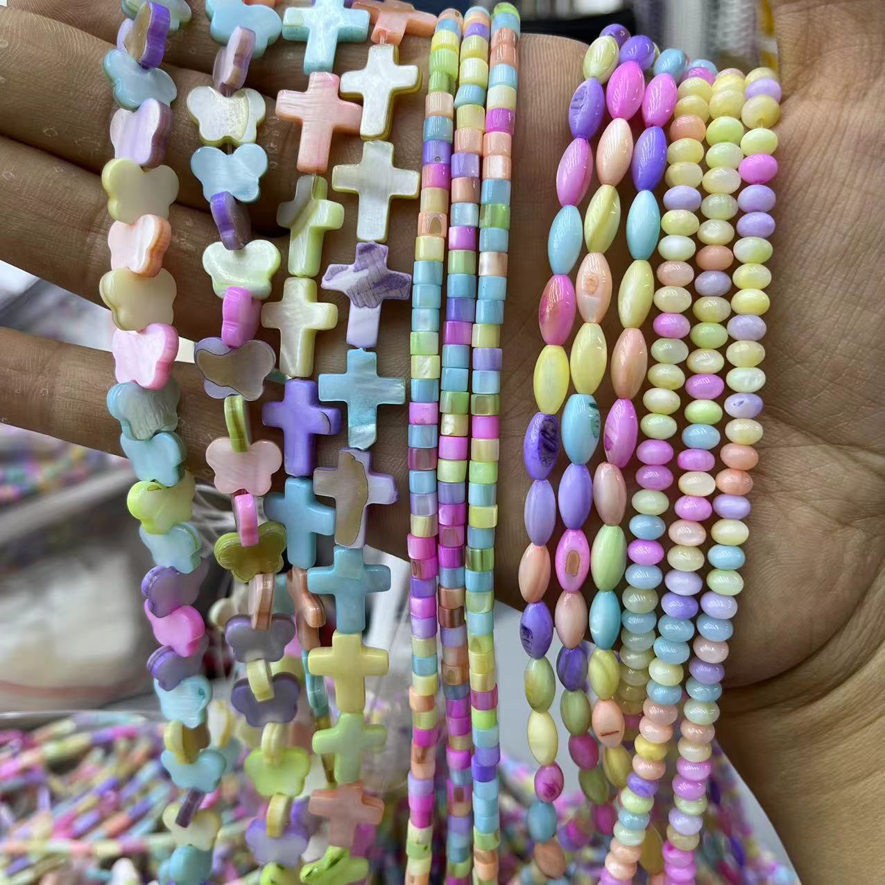 1:3*4mm spacers/about 116 pieces2:4*8mm round tube/about 48 pieces3:3*4mm abacus beads/about 116 pieces4:3*5mm abacus beads/about 116 pieces5:3*5mm rice beads/about 80 pieces6:5*10mm rice beads/about 39 pieces7:8*11mm butterflies/about 54 pieces8:12*14mm cross/about 27 pieces9:8mm horizontal hole heart shape/about 47 pieces10:8mm heart shape/about 50 pieces11:10mm heart shape/about 39 pieces