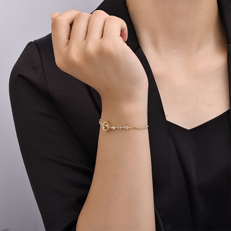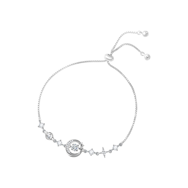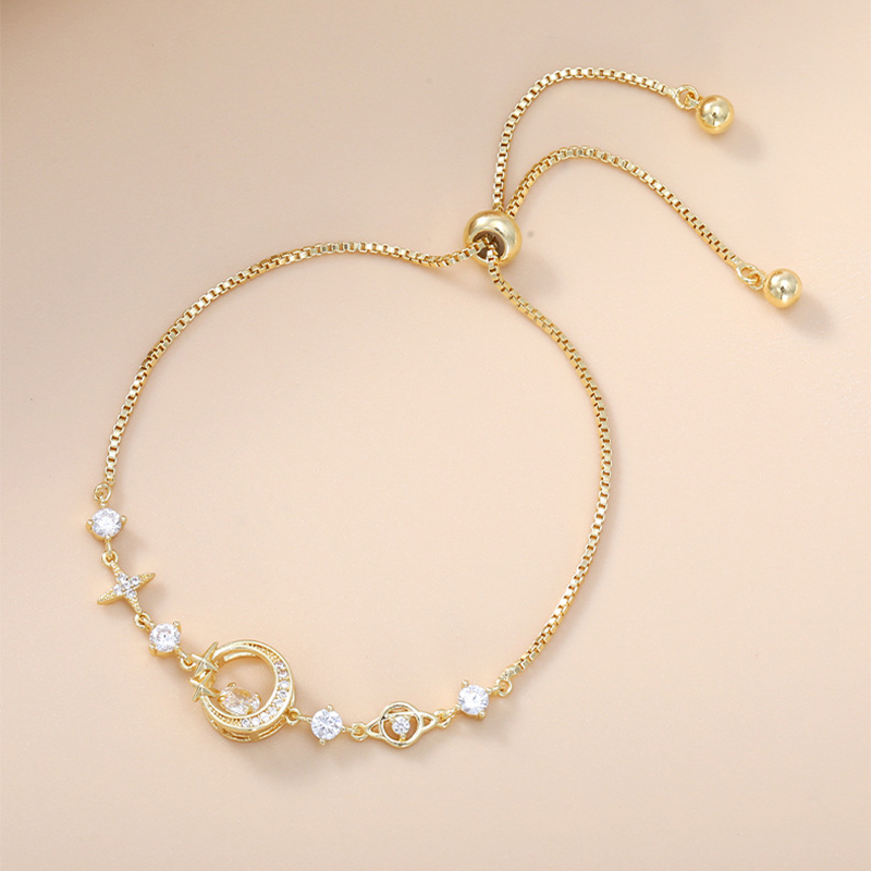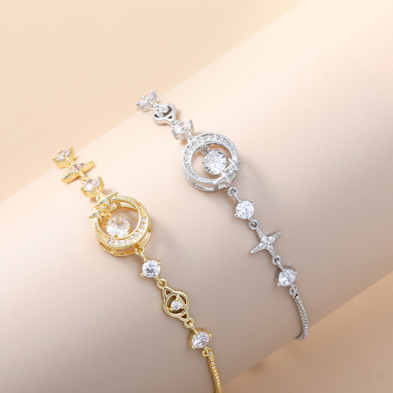 Prás Bracelet, Moon agus Star, plátáilte, inchoigeartaithe & slabhra bosca & micrea réiteach zirconia ciúbach & do bhean, dathanna níos mó le haghaidh rogha, Fad Thart 6-9 Inse, Díolta De réir PC