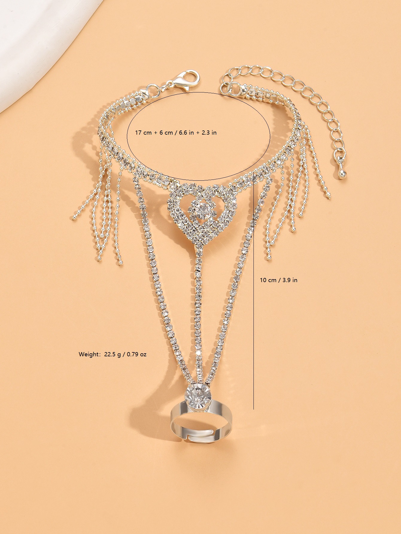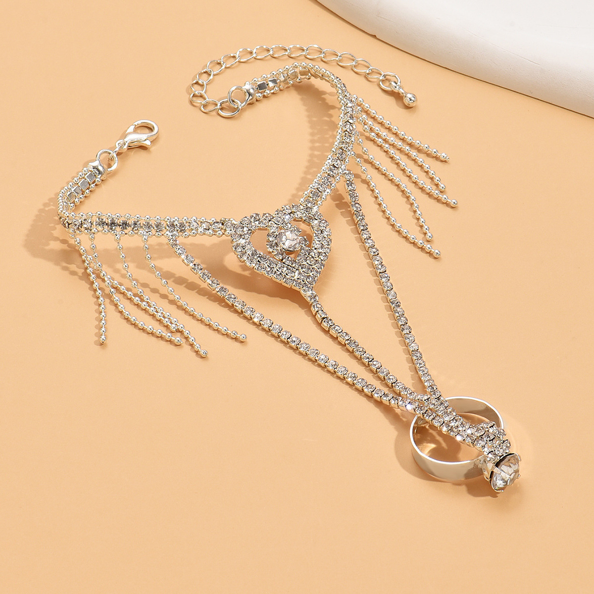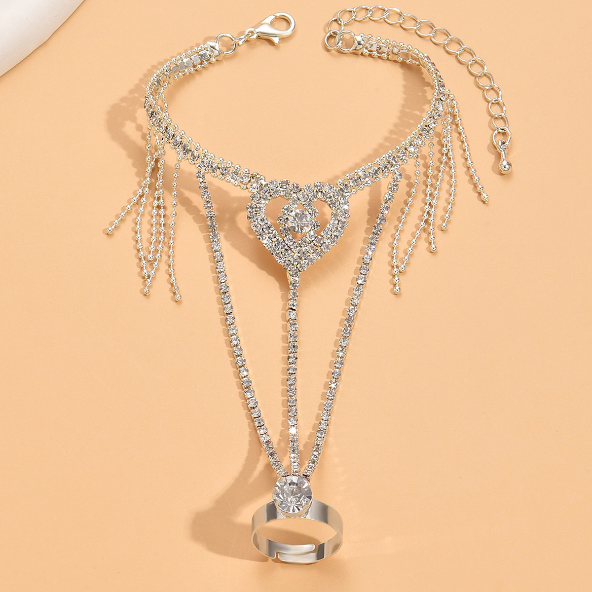 Prás Bracelet Ring, Croí, dath airgid plated, do bhean & le rhinestone, Díolta De réir PC