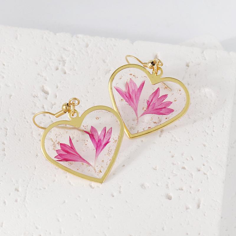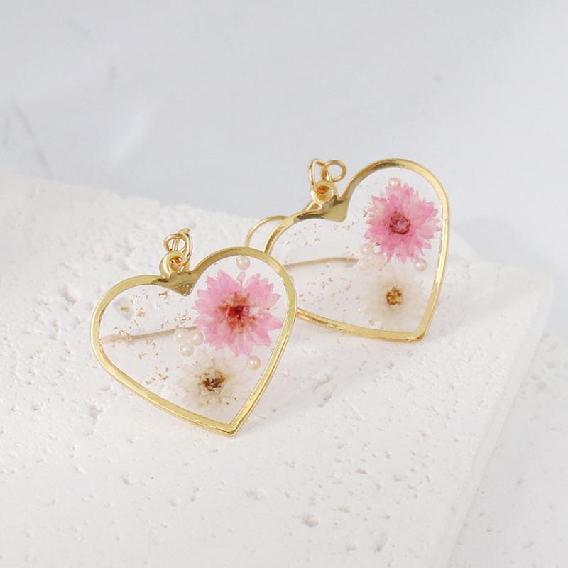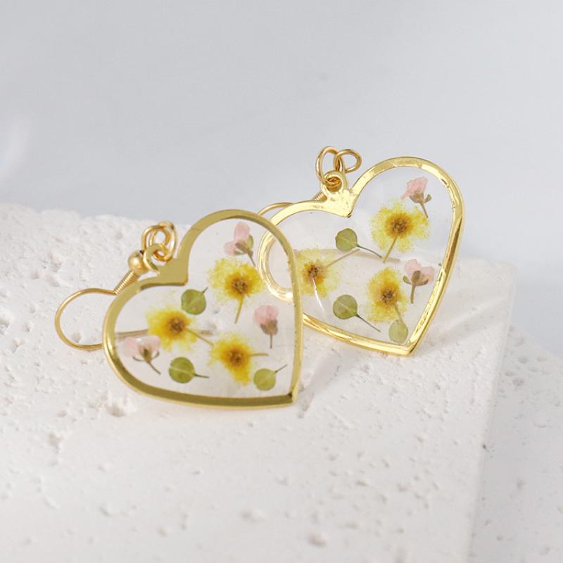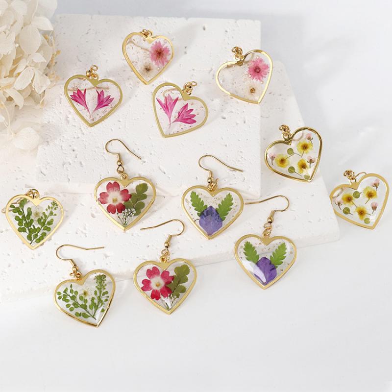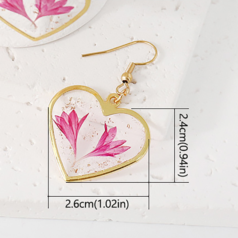 Cink ötvözet Csepp Fülbevaló, -val Szárított virág & Gyanta & 304 rozsdamentes acél, Szív, epoxy matrica, divat ékszerek & különböző modellek a választás & a nő, aranysárga, 6párok/Bag, Által értékesített Bag