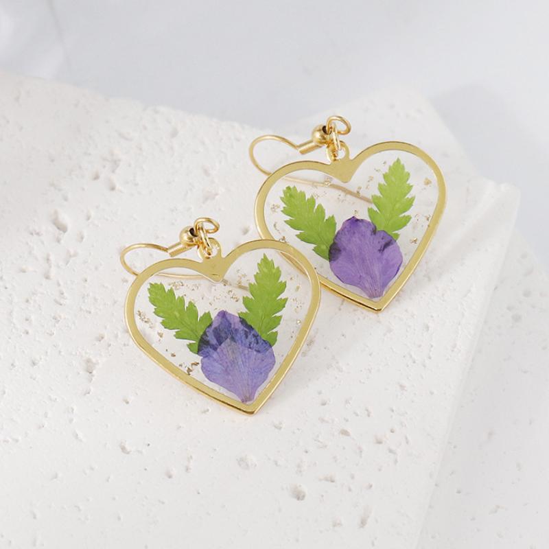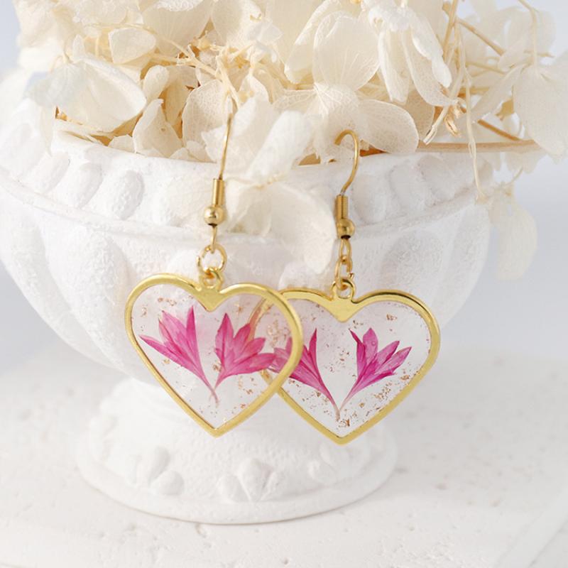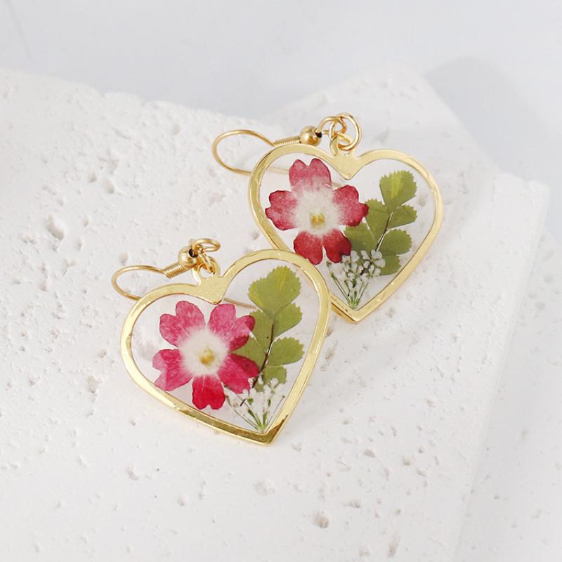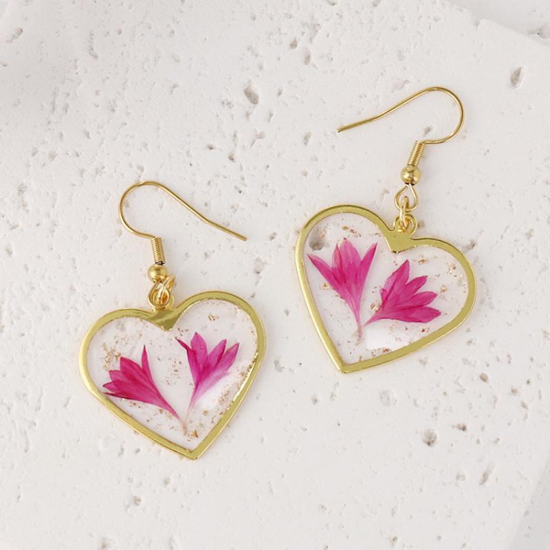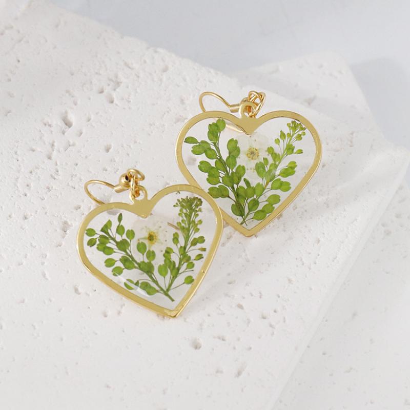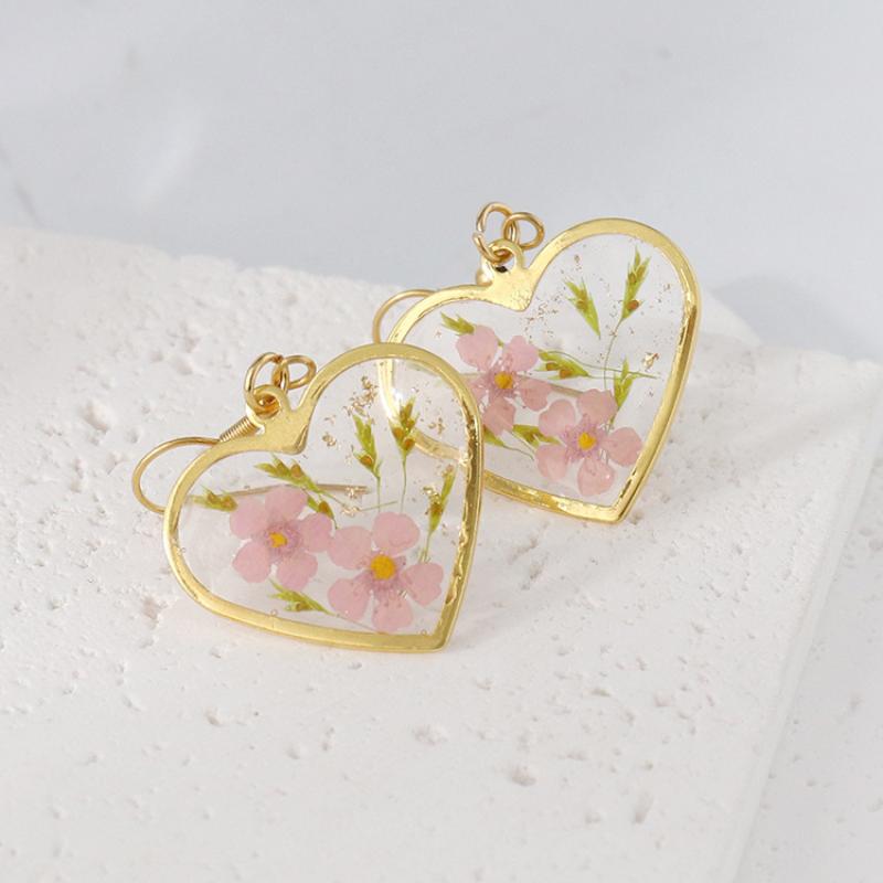 Cink ötvözet Csepp Fülbevaló, -val Szárított virág & Gyanta & 304 rozsdamentes acél, Szív, epoxy matrica, divat ékszerek & különböző modellek a választás & a nő, aranysárga, 6párok/Bag, Által értékesített Bag