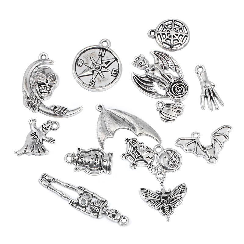 1:Bat (23x15mm)2:Compass (20x23mm)3:Ghost (15x21mm)4:Pumpkin (10x10mm)5:Skeleton (9x39mm)6:Bat wings (27.5x19mm)7:Bagua (10x13mm)8:Bat hand (8.5x20mm)9:Skeleton arrow (18x22mm)10:Skeleton spider web (11x18.5mm)11:Pumpkin lamp (11x19mm)12:Spider web (14x17mm)13:Skeleton moon (19x29mm)14:Bat rose (19x26.5mm)
