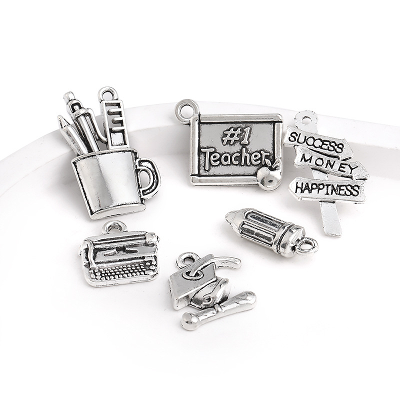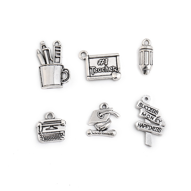 1:Pencil (18x 6x 4mm)2:Blackboard (19 x15x2mm)3:Graduation cap (16.5 x17x3mm)4:Typewriter (14.5x 14.5x 2mm)5:Plate (25x 14x 1.5mm)6:Pen holder (24 x14x3mm)
