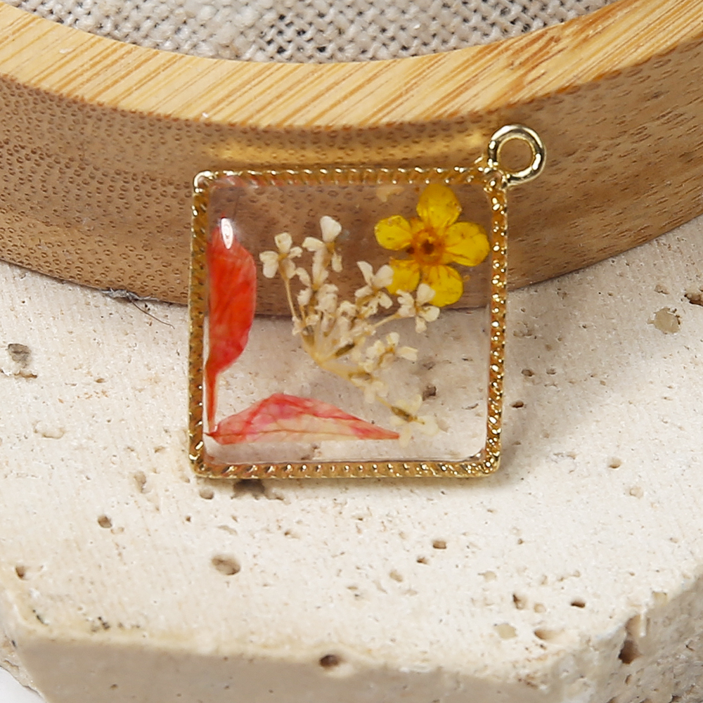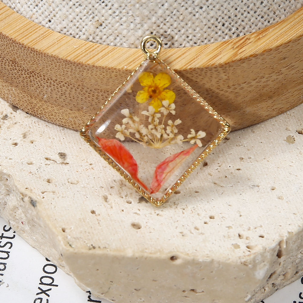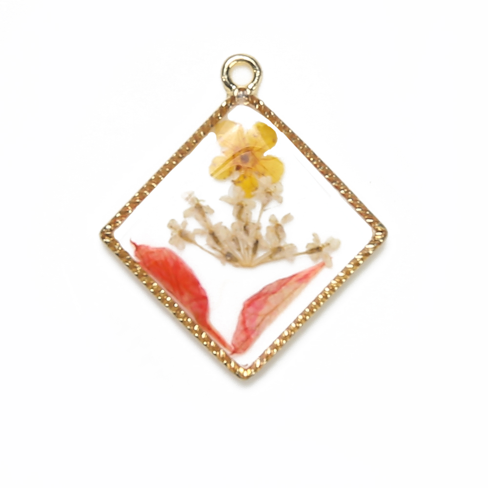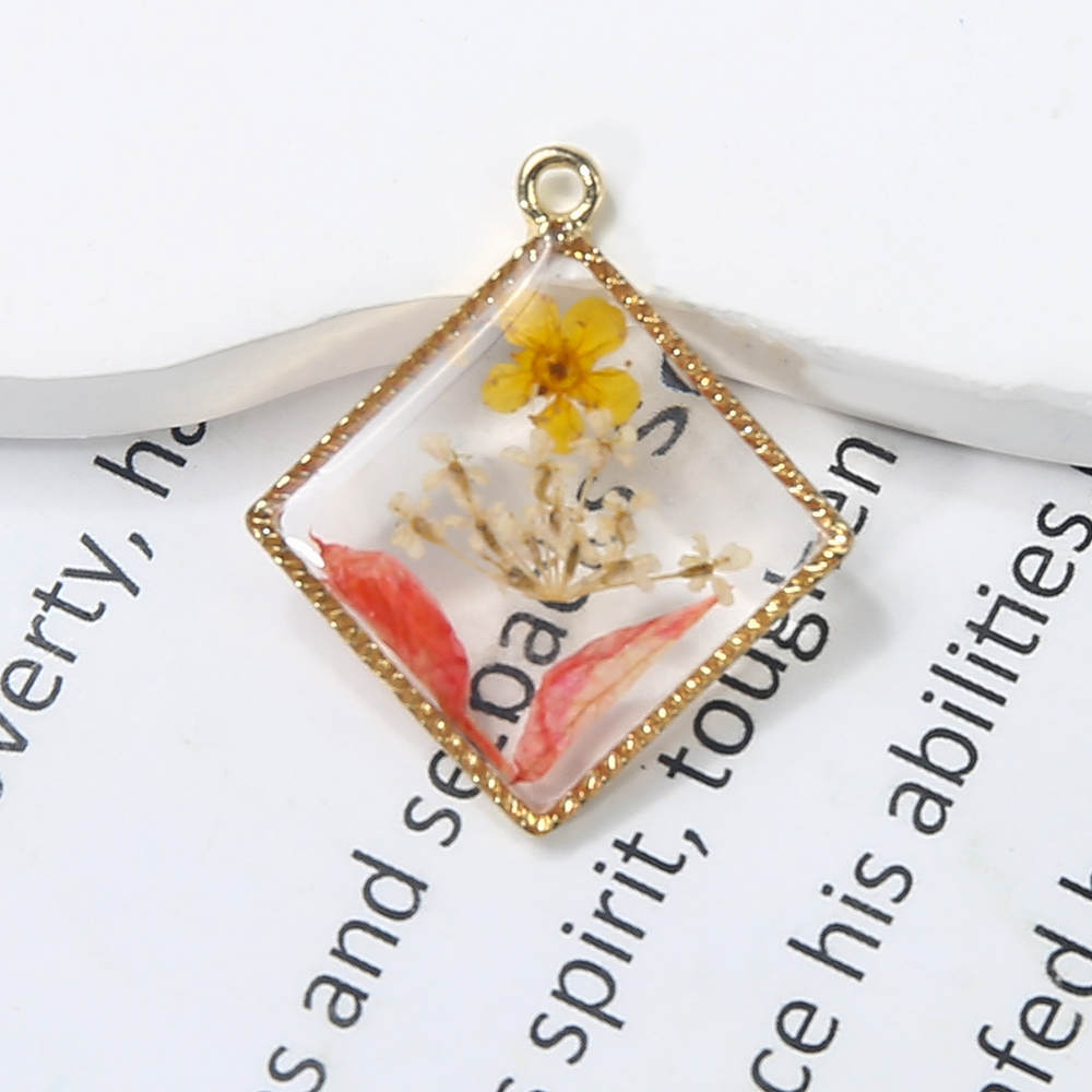 Sárgaréz Függő, -val Szárított virág & Gyanta, Rombusz, galvanizált, DIY, kevert színek, nikkel, ólom és kadmium mentes, 25.52x3.27x29.78mm, Által értékesített PC