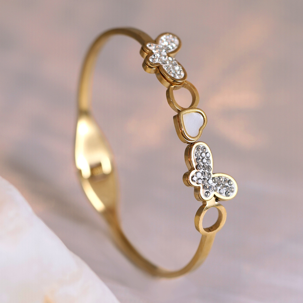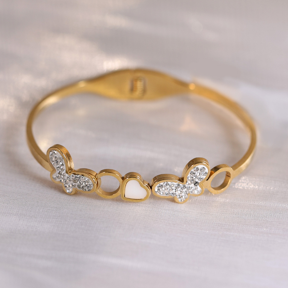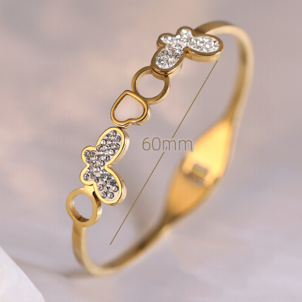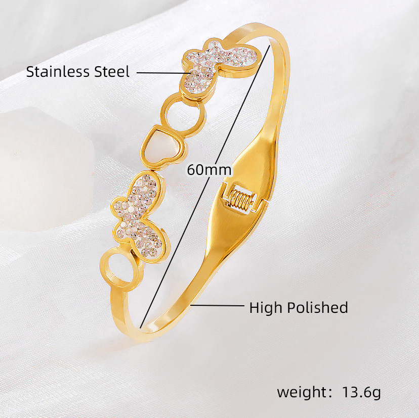 Titantium acciaio bracciale, with bianco conchiglia, Farfalla, placcato color oro, per la donna & con strass, Diametro interno:Appross. 60x50mm, Venduto da PC