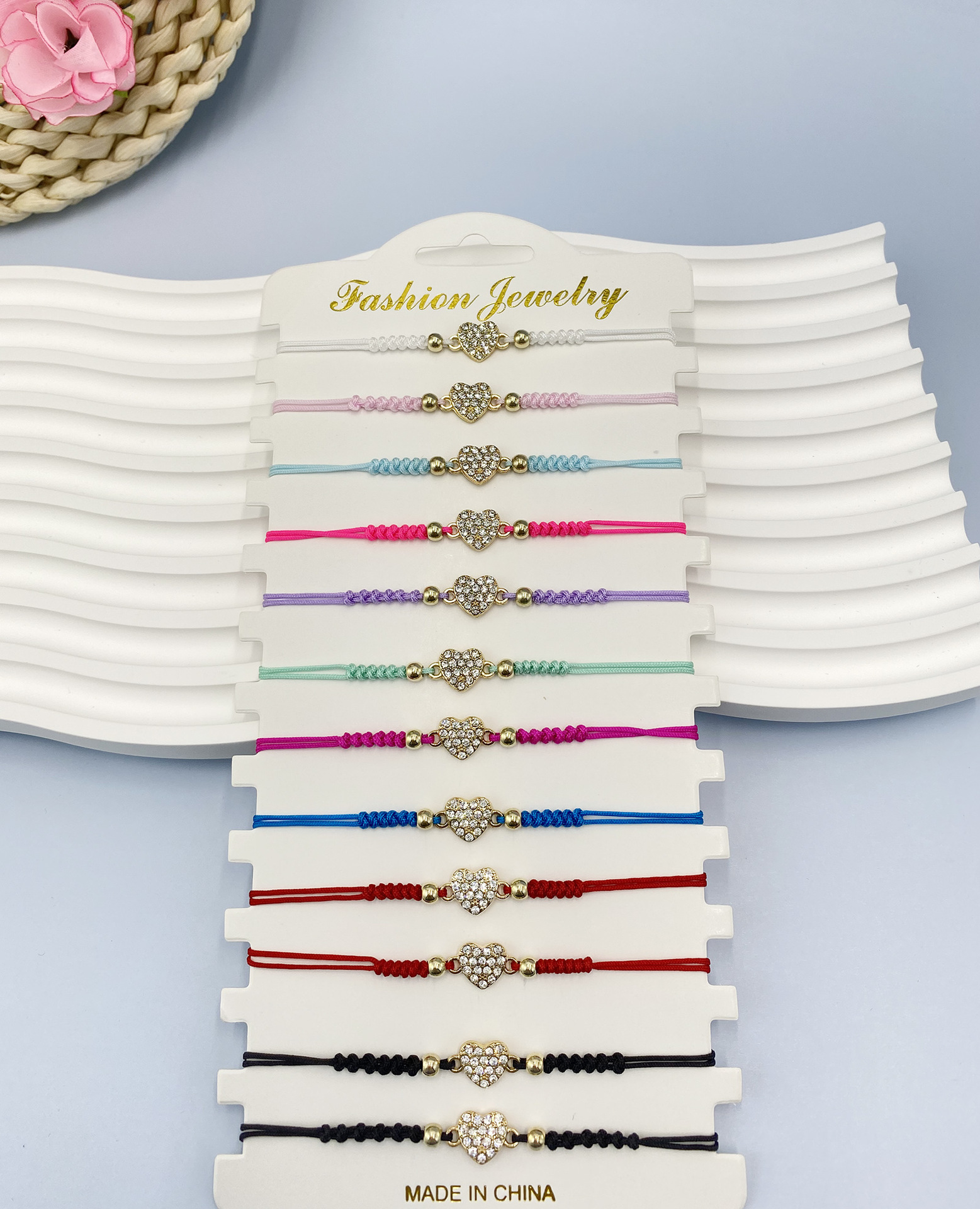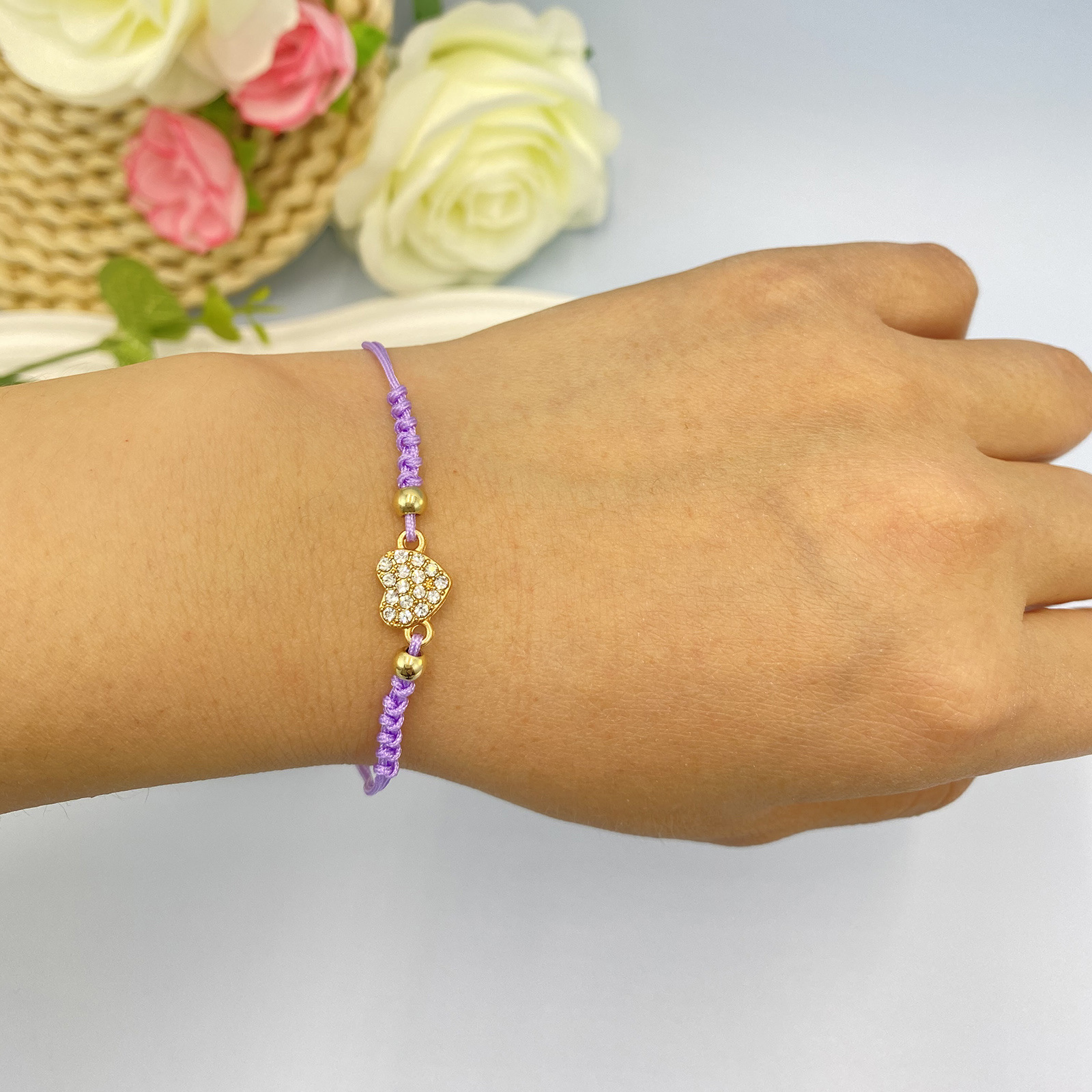 Bracciale in lega di zinco, lega in zinco, with Cordone di nodi, Cuore, placcato color oro, Regolabile & per la donna & con strass, colori misti, assenza di nichel,piombo&cadmio, Lunghezza 28 cm, Venduto da set