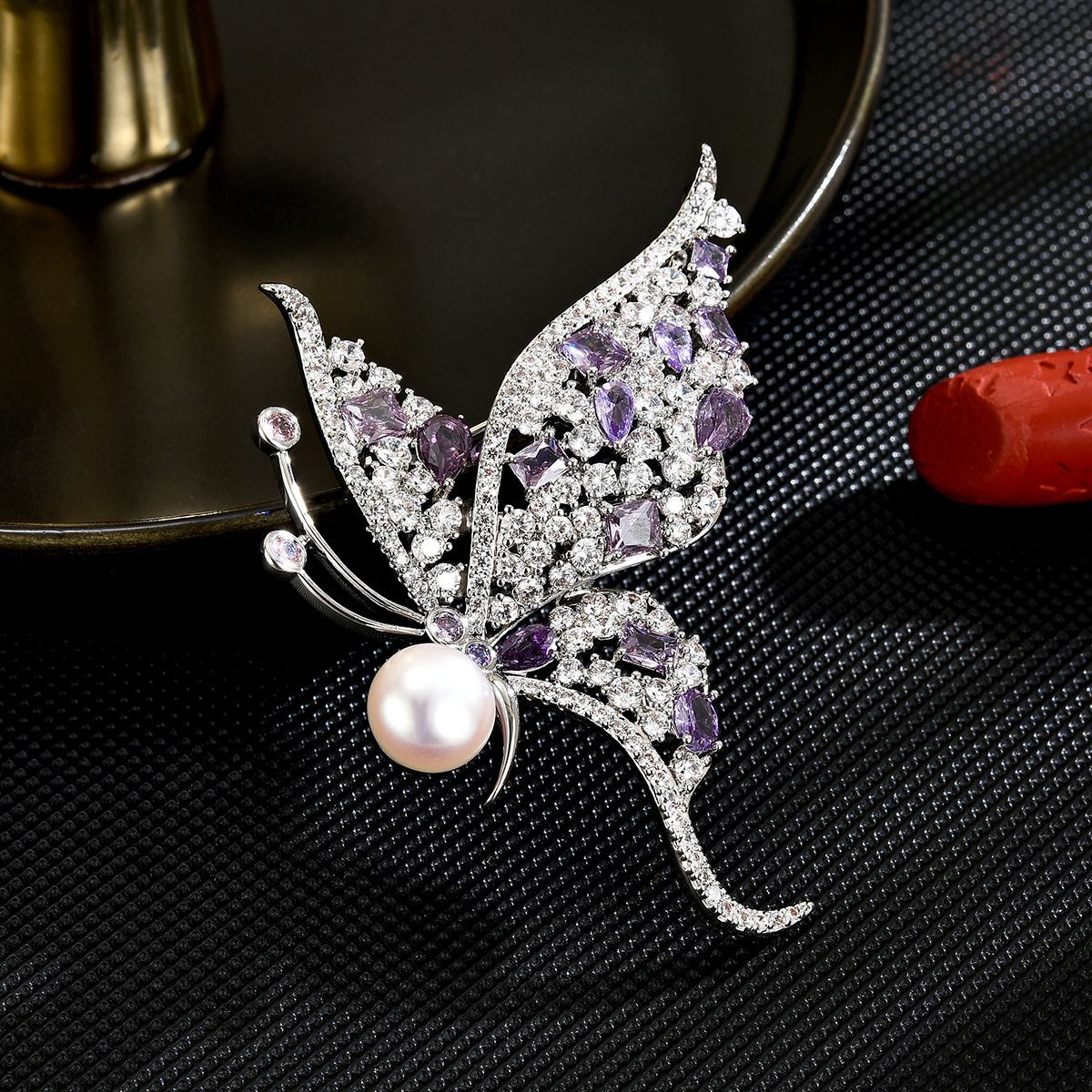 Gioielli spilla alla moda , ottone, with Shell Pearl, placcato, Micro spianare cubic zirconia & per la donna, argento, 62x40mm, Venduto da PC