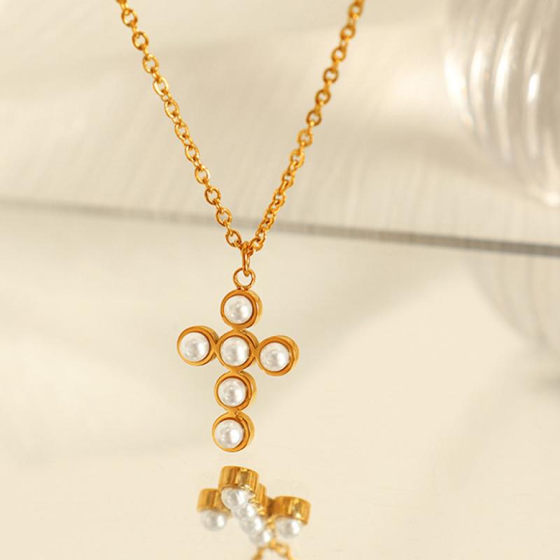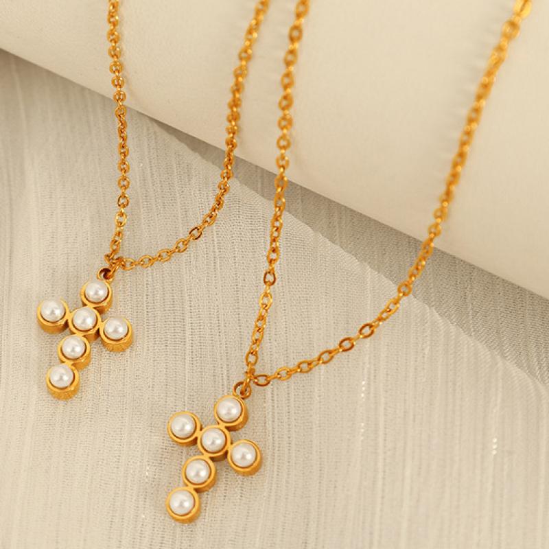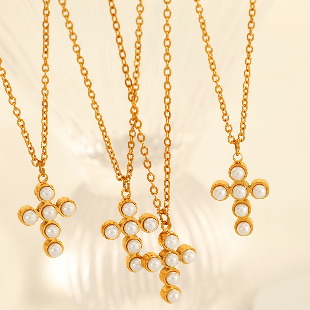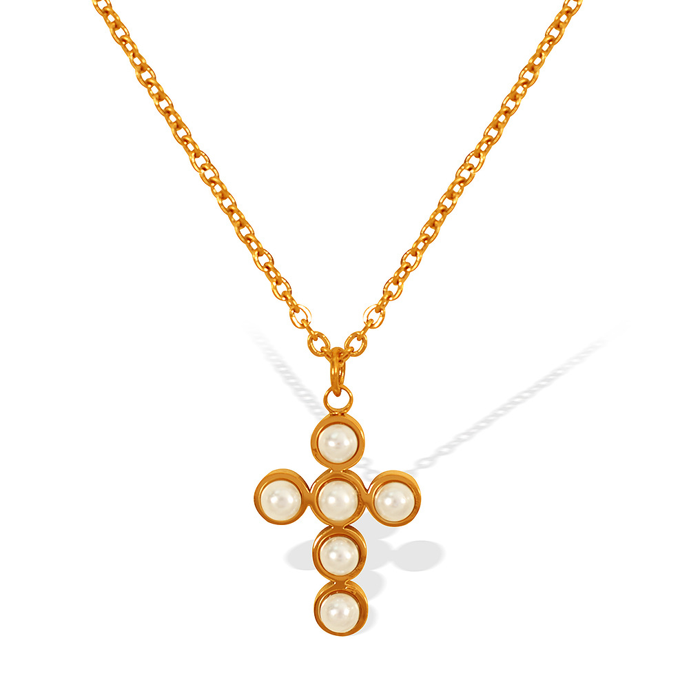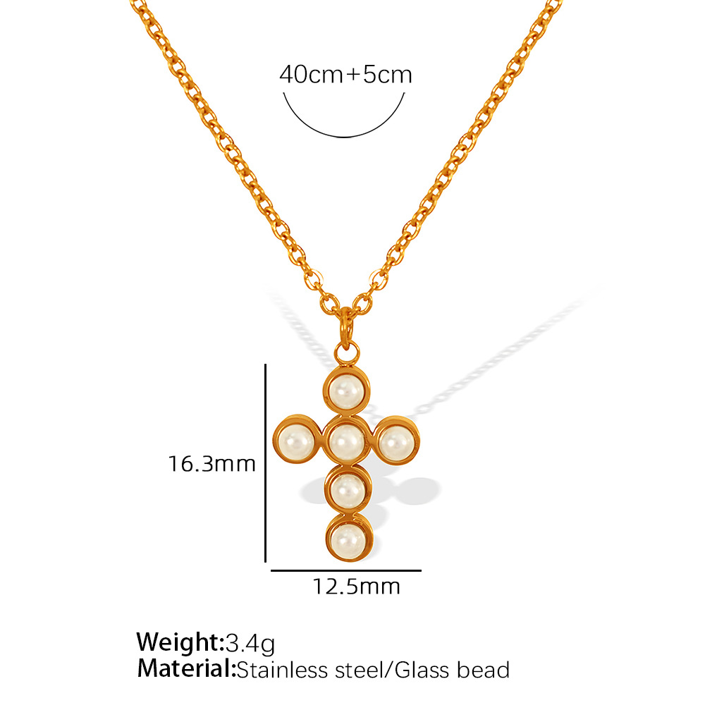 Collana in acciaio inossidabile, 304 acciaio inox, with perla in plastica, with 5cm extender chain, Croce, per la donna, dorato, Lunghezza 40 cm, Venduto da PC