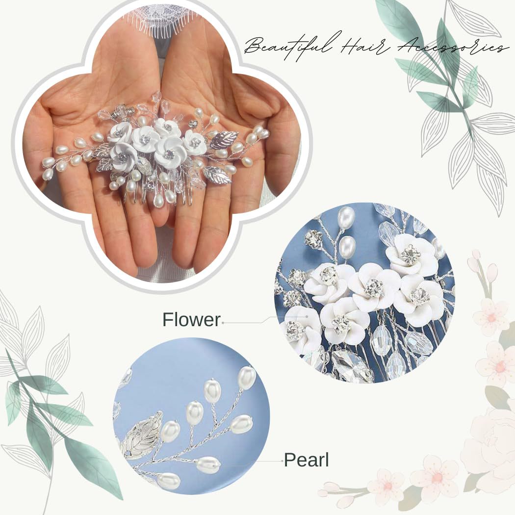 Bridal capelli decorativo Comb, perla in plastica, with filo di ottone & argilla polimero & cristallo, fatto a mano, gioielli di moda & per la donna & con strass, argento, 150x80mm, Venduto da set