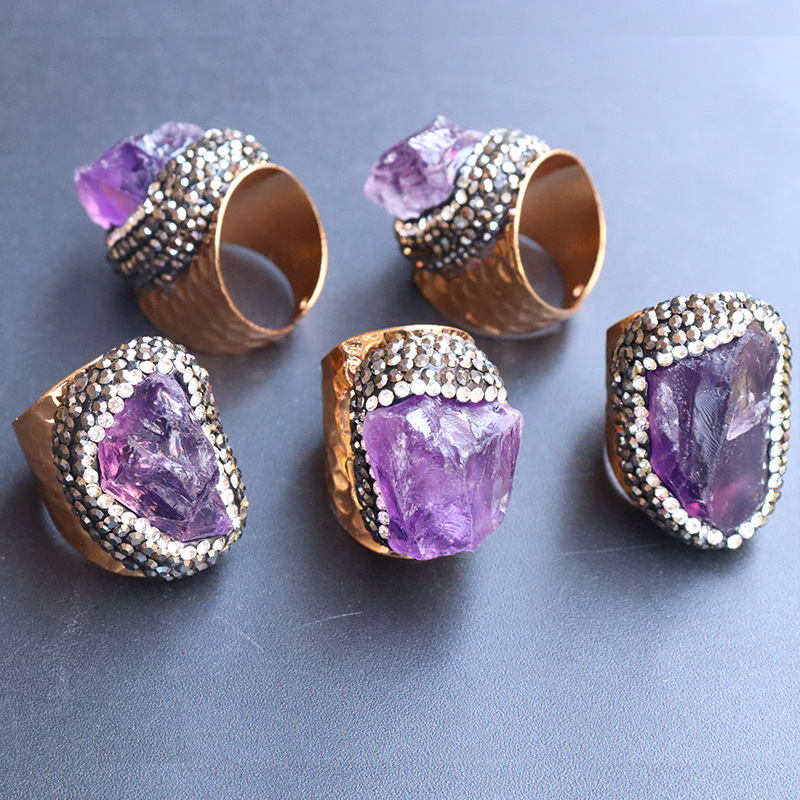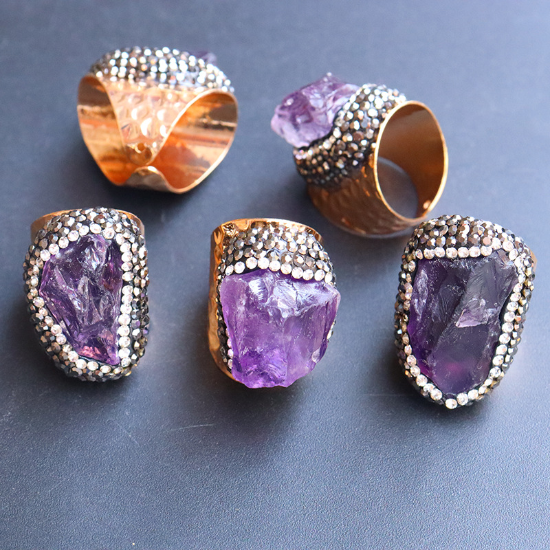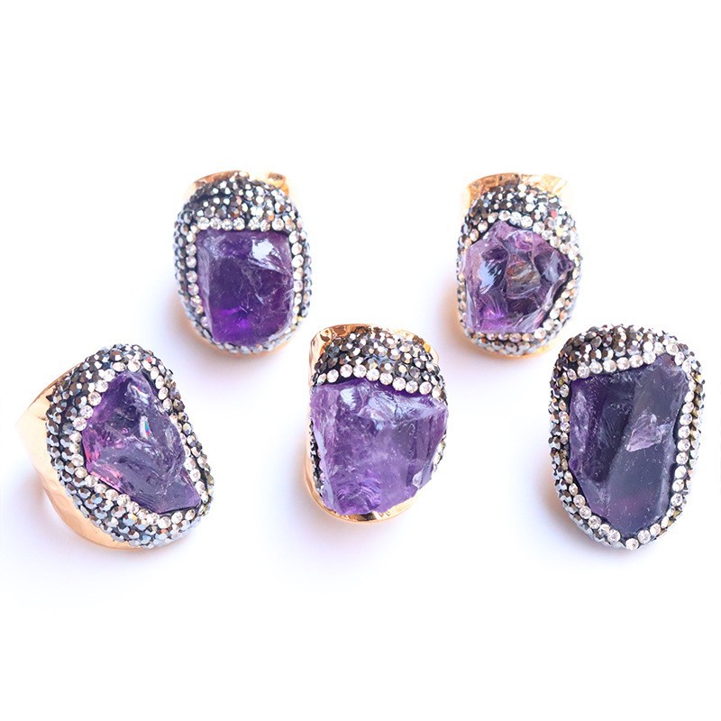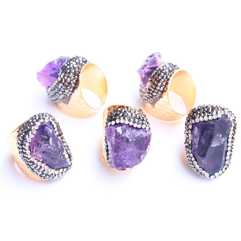 Naturale anello di barretta al quarzo, ottone, with ametista, placcato color oro, inviato casualmente & unisex & con strass, viola, assenza di nichel,piombo&cadmio, inner diameter:17~20mm, Venduto da PC