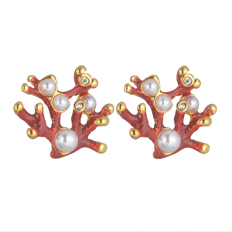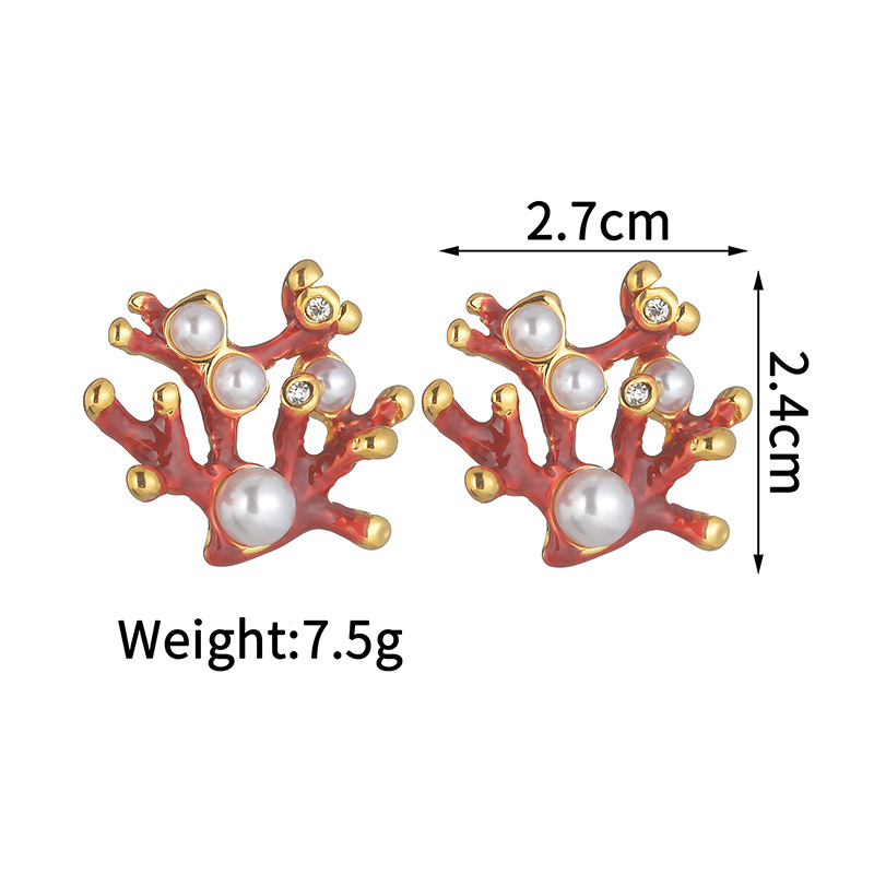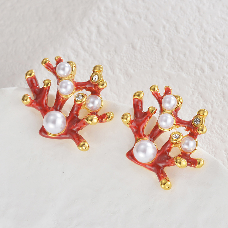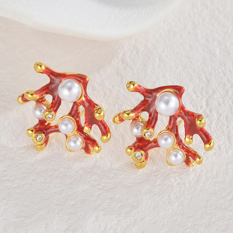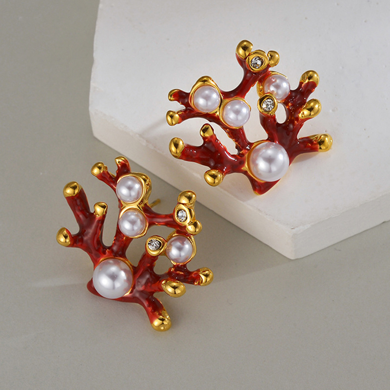 Orecchini in acciaio inossidabile, 304 acciaio inox, with perla in plastica, placcato color oro, per la donna & smalto & con strass, rosso, Venduto da coppia