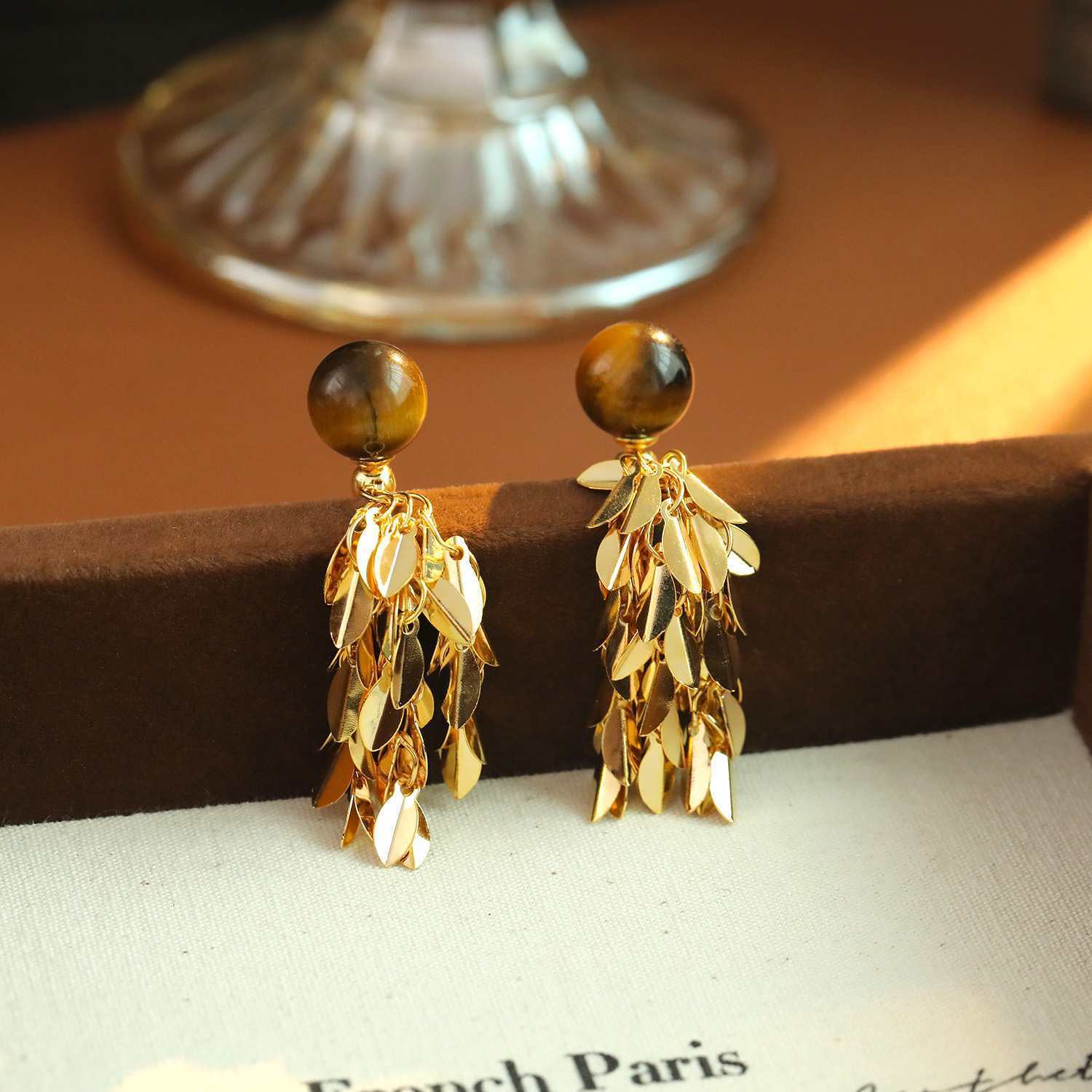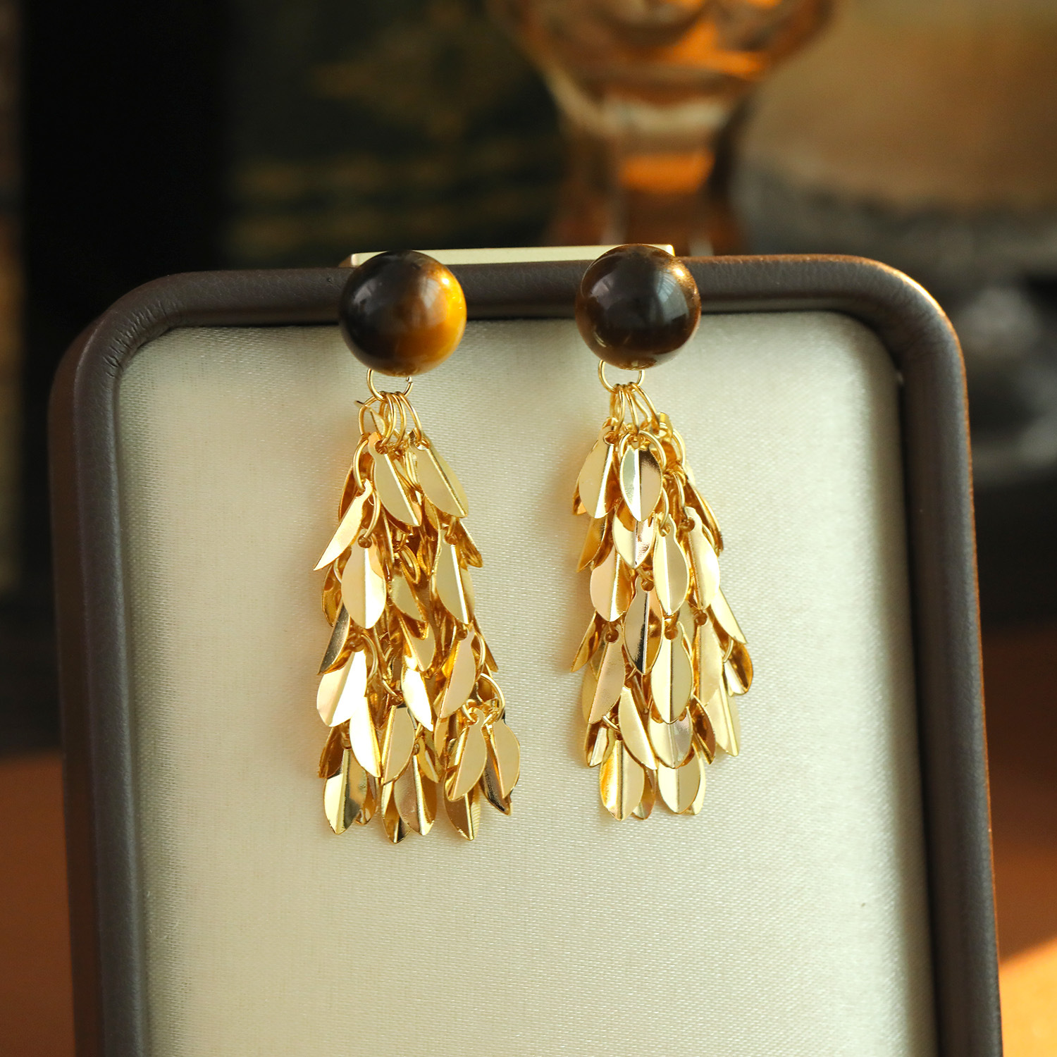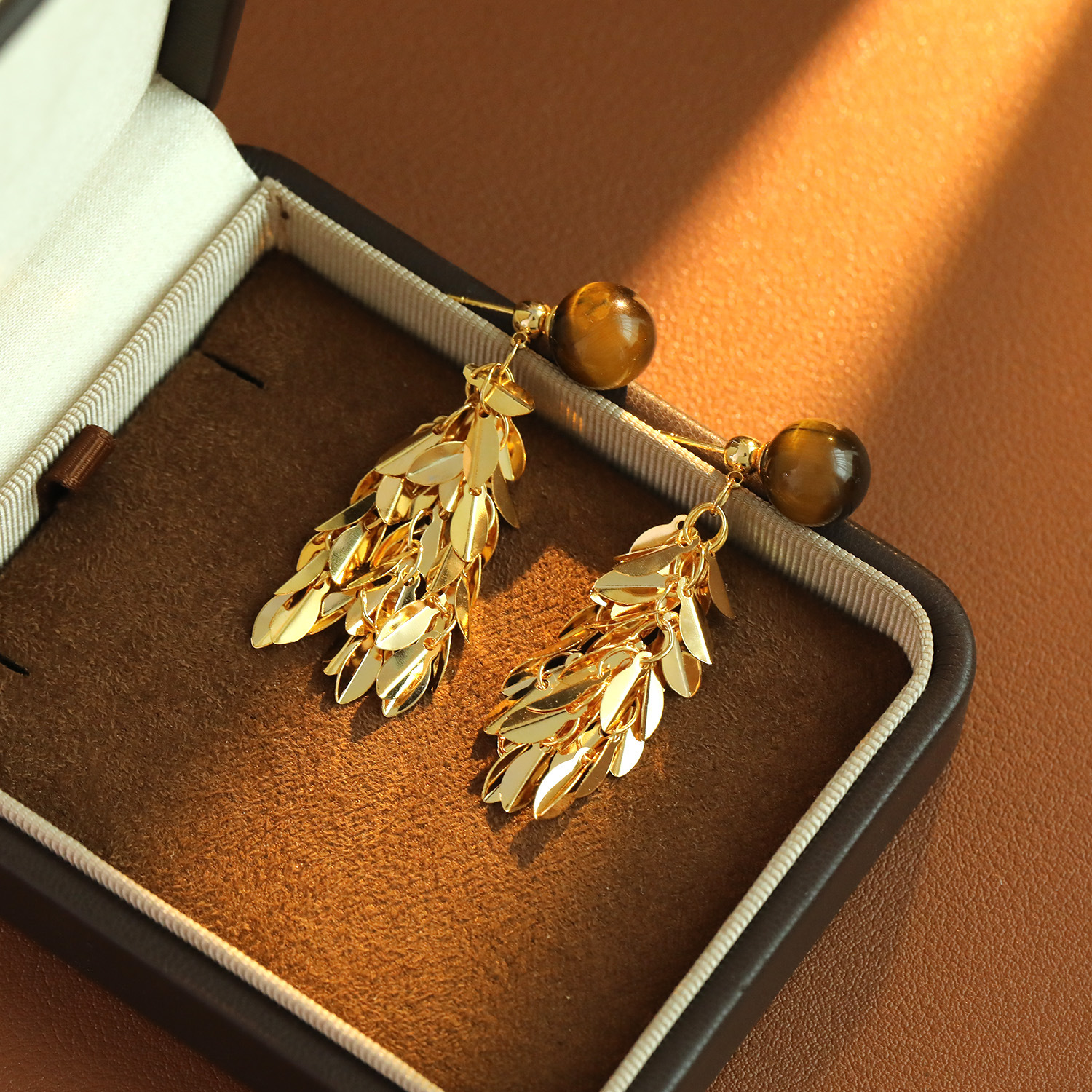 Ottone Orecchino con pendente, with occhio di tigre, Foglia, Placcato oro 18K, gioielli di moda & per la donna, 26x20mm, Venduto da coppia