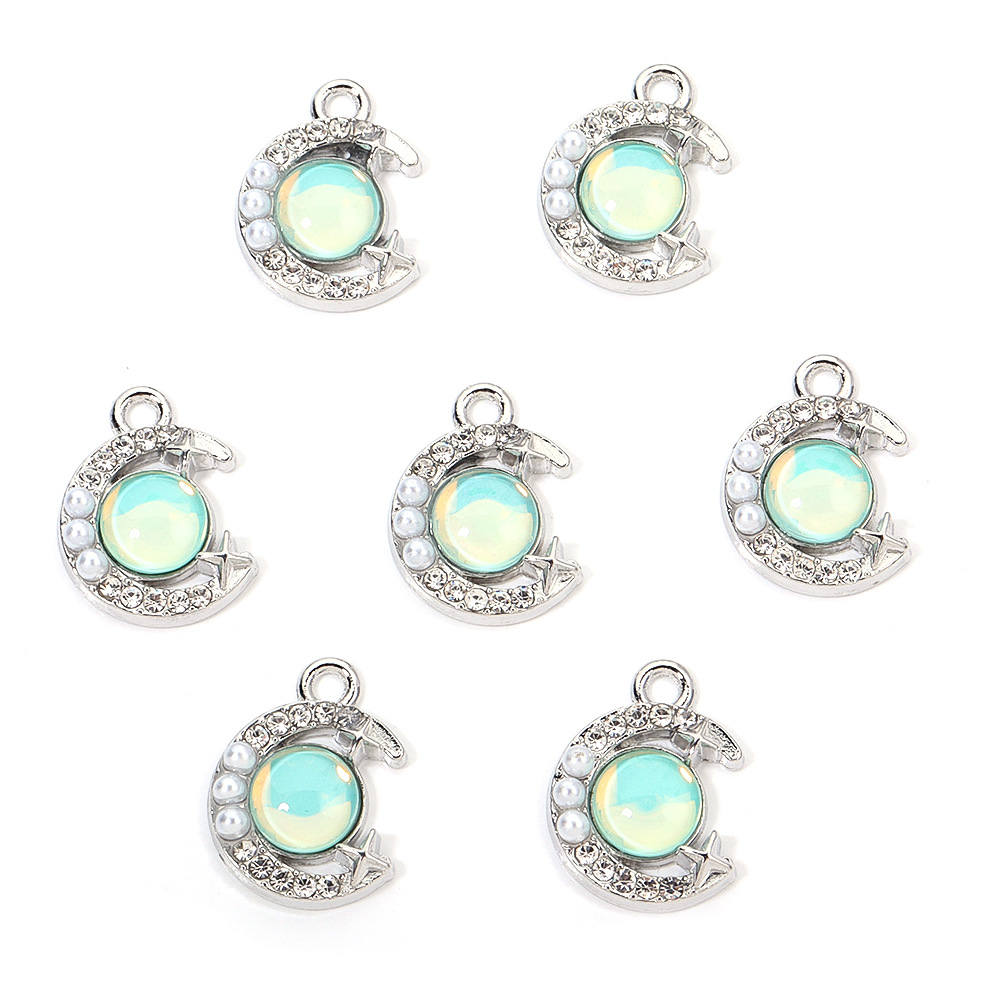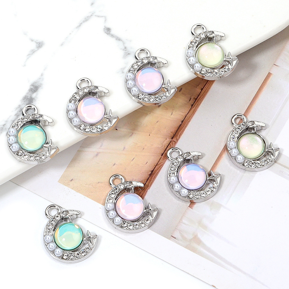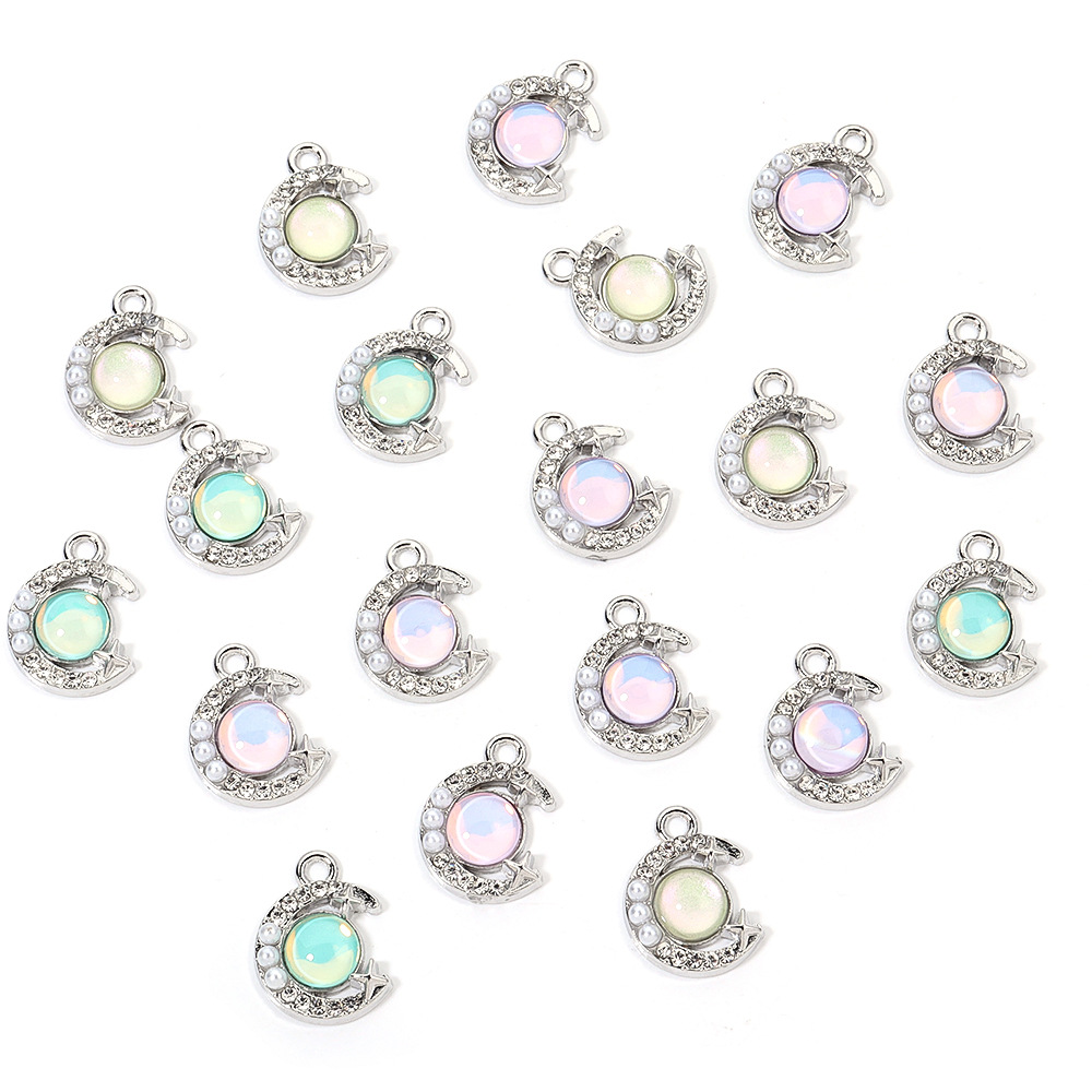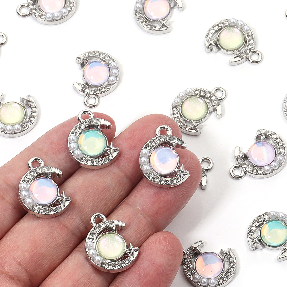 Resina Zinc Alloy pendenti, lega in zinco, with cubico zircone & perla in plastica, Luna, placcato color argento, DIY, nessuno, assenza di nichel,piombo&cadmio, 15x20mm, 100PC/borsa, Venduto da borsa