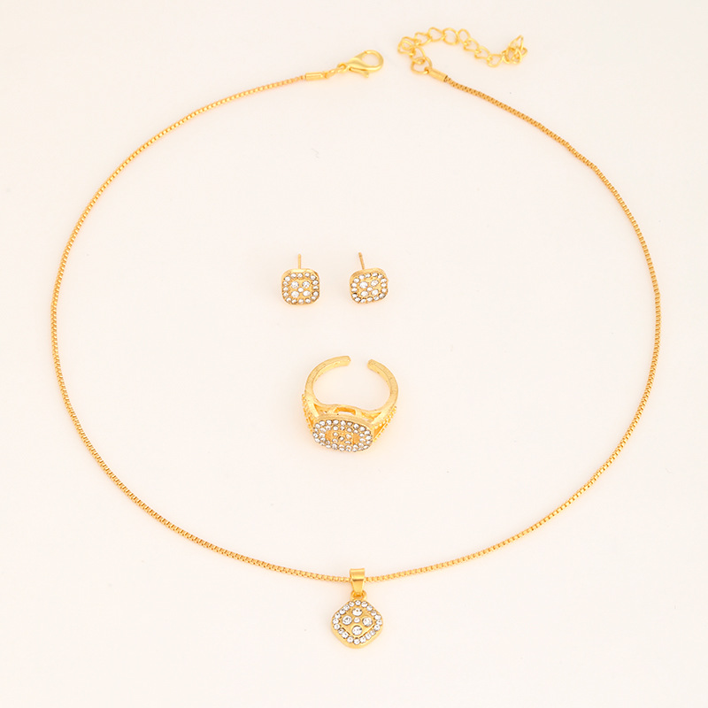 lega in zinco set di gioielli fashion, Orecchino a bottone & anello dito & Collana, Motivo geometrico, placcato, tre pezzi & per la donna & con strass, nessuno, necklace length 18.9inch, Misura:6-8, Venduto da set