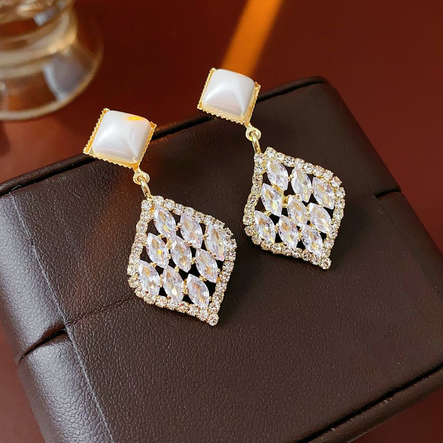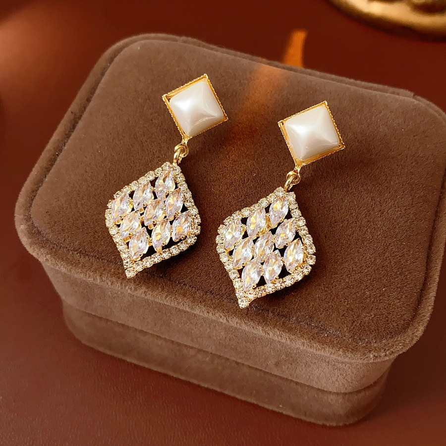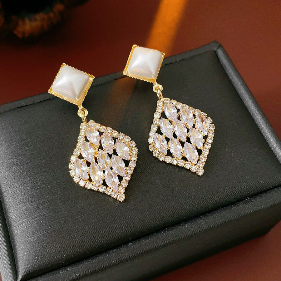 ottone orecchini a goccia, with perla in plastica, Rhombus, placcato color oro, per la donna & con strass, 17x40mm, Venduto da coppia