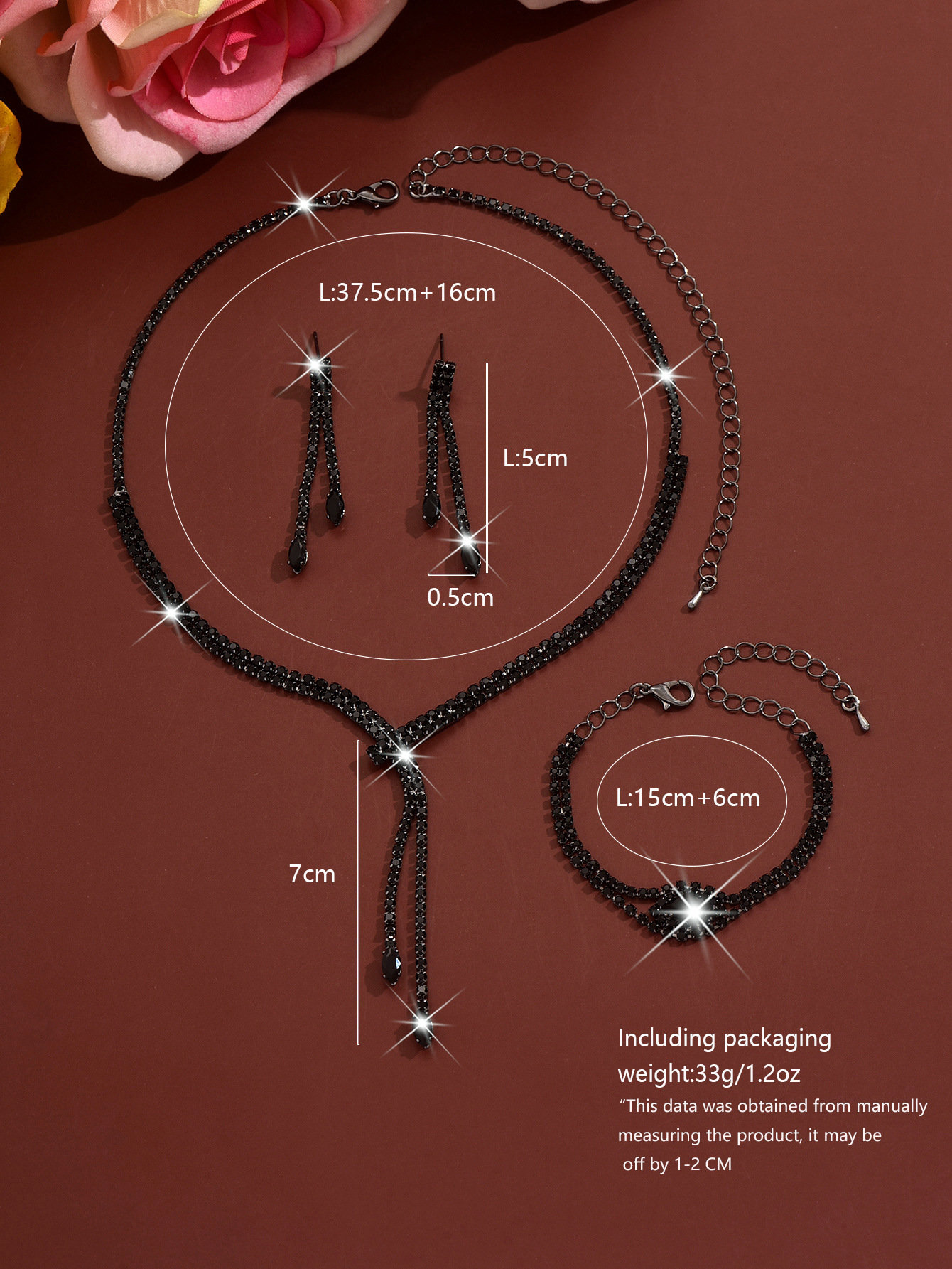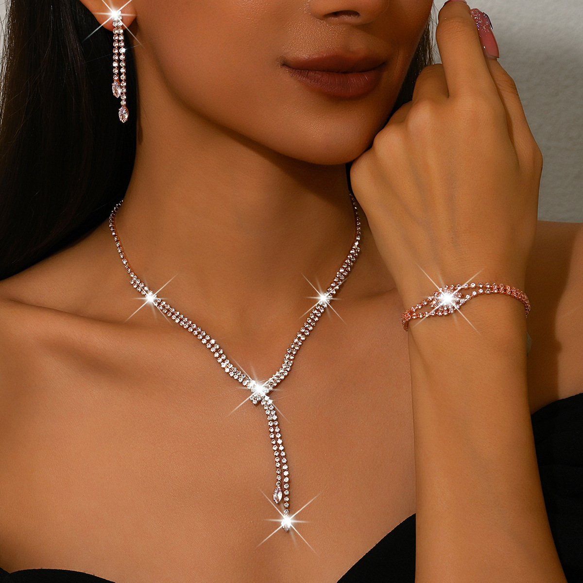 1:A silver necklace earring set2:B silver necklace earrings bracelet3:C silver necklace earrings bracelet ring4:D rose gold necklace earrings5:E gold necklace earrings6:F black necklace earrings7:G rose gold necklace earrings bracelet8:H gold necklace earrings bracelet9:I black necklace earrings bracelet