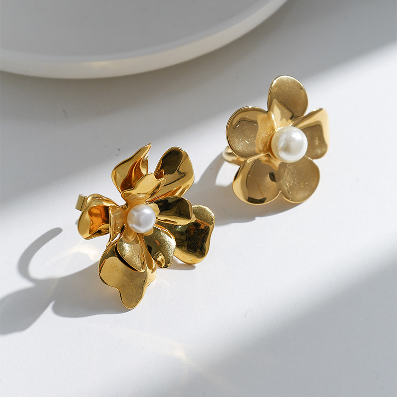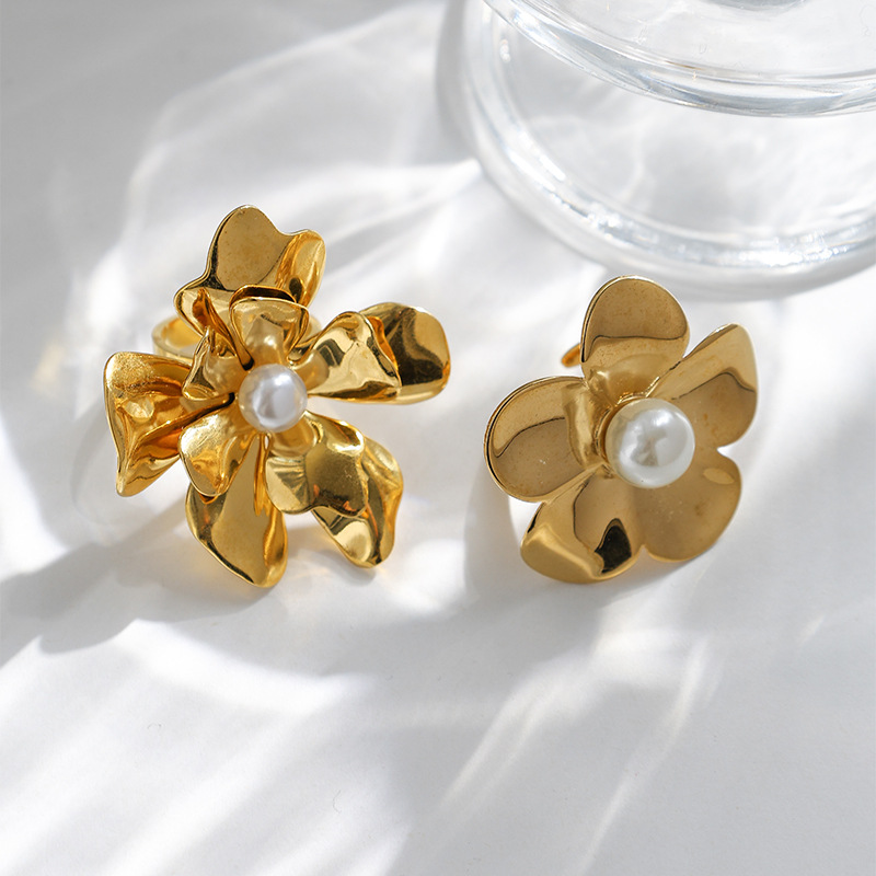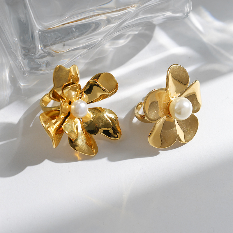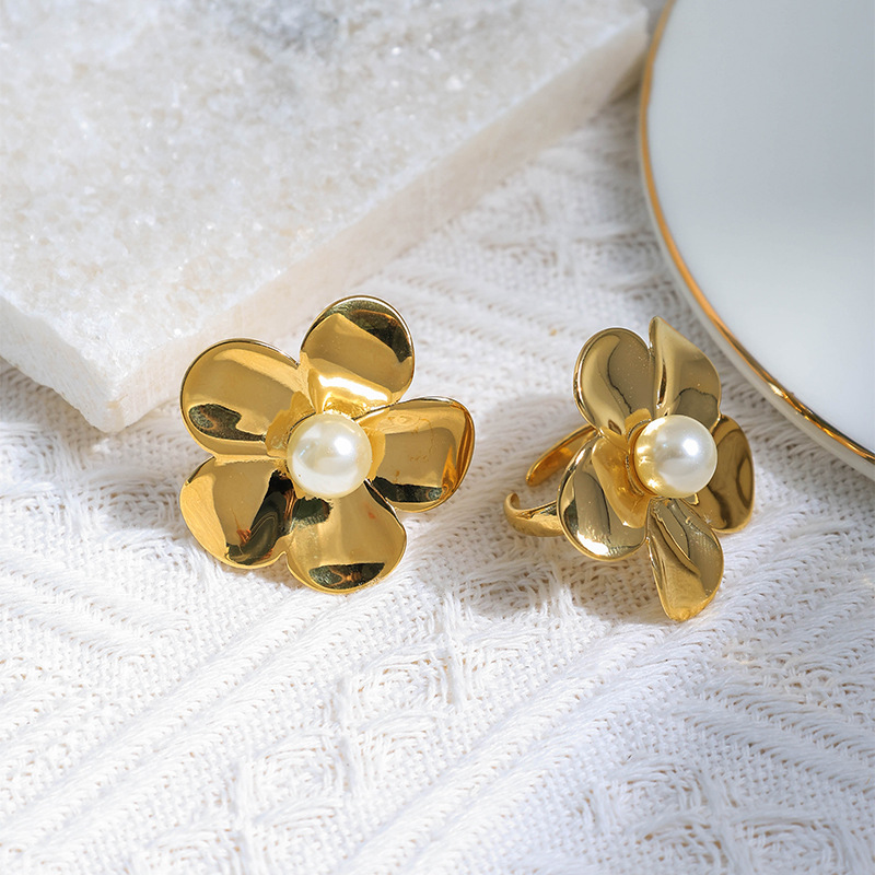 Vinger Ring in edelstaal, 304 roestvrij staal, met Plastic Pearl, Bloem, plated, mode sieraden & verschillende stijlen voor de keuze & voor vrouw, gouden, Verkocht door PC