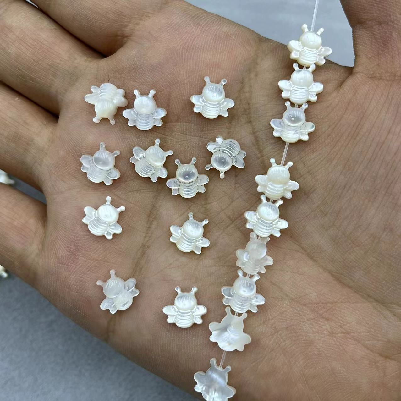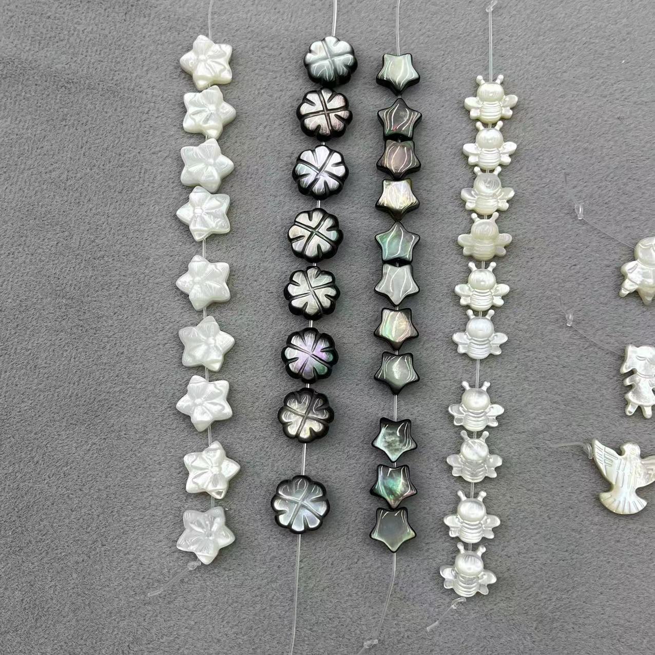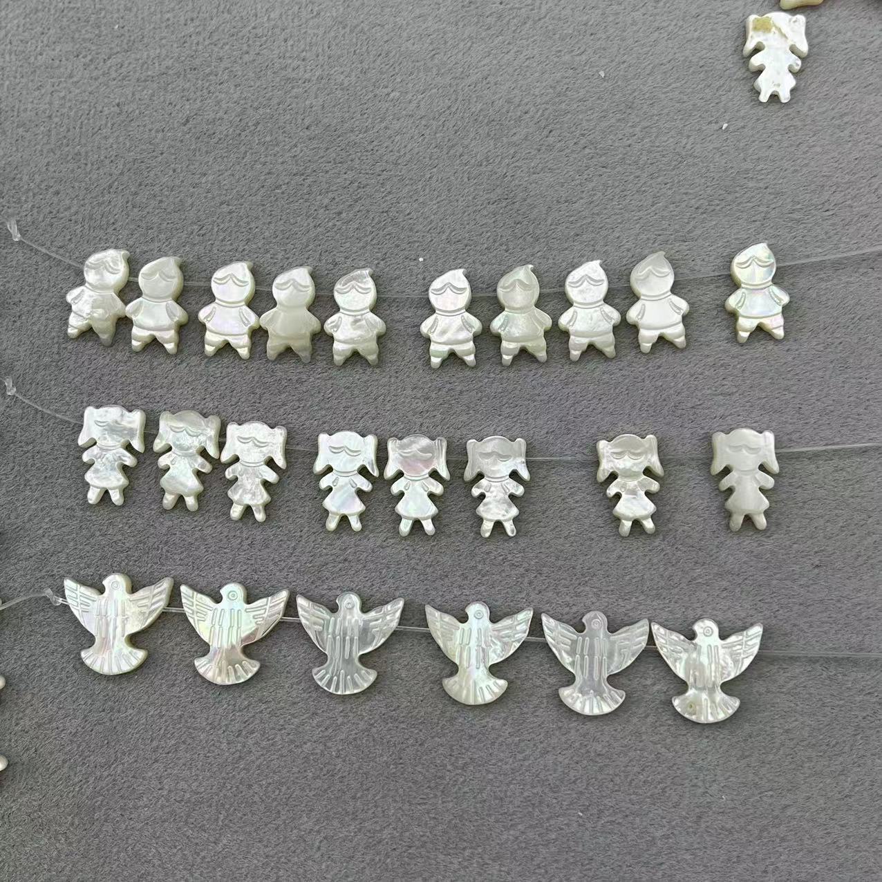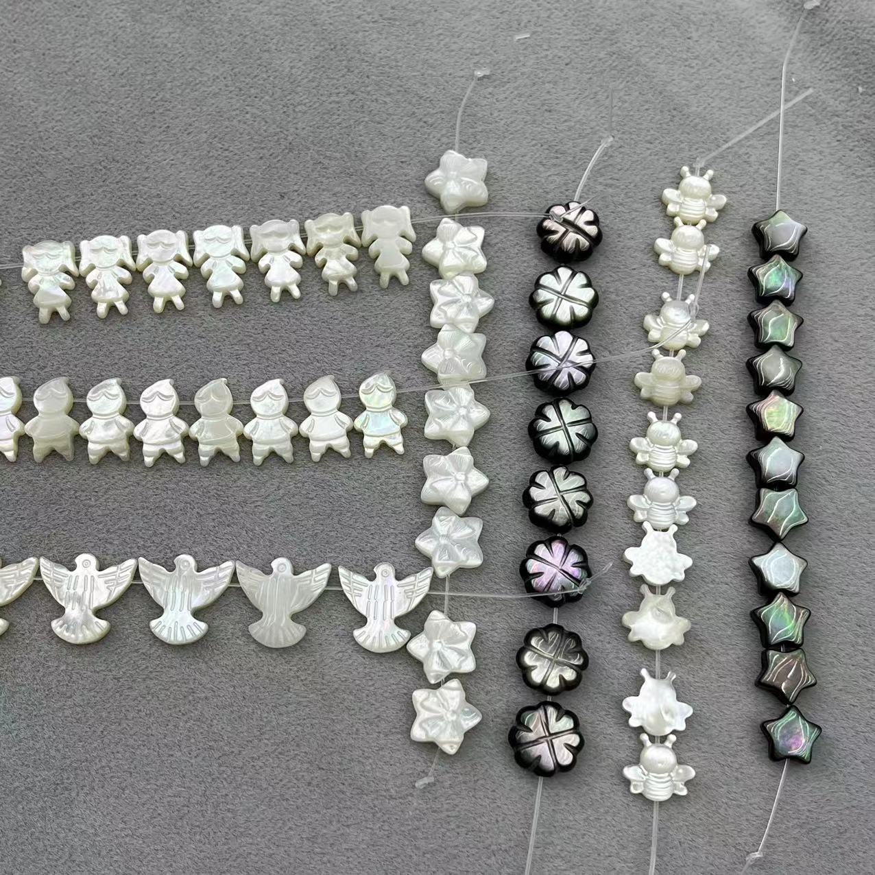 1:Black shell 9MM flower2:Black shell 8mm five-pointed star3:White shell 10mm five-pointed star4:White shell 13*12MM peace dove5:White shell 9*10mm bee6:White shell 7*12MM girl7:White shell 7*12MM boy