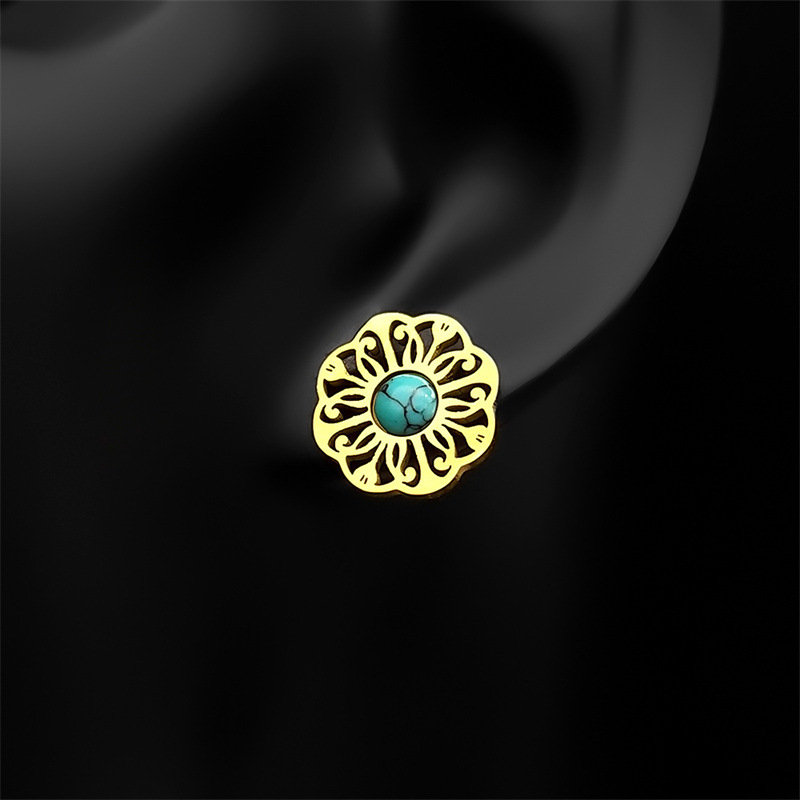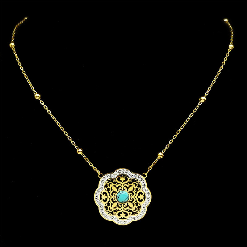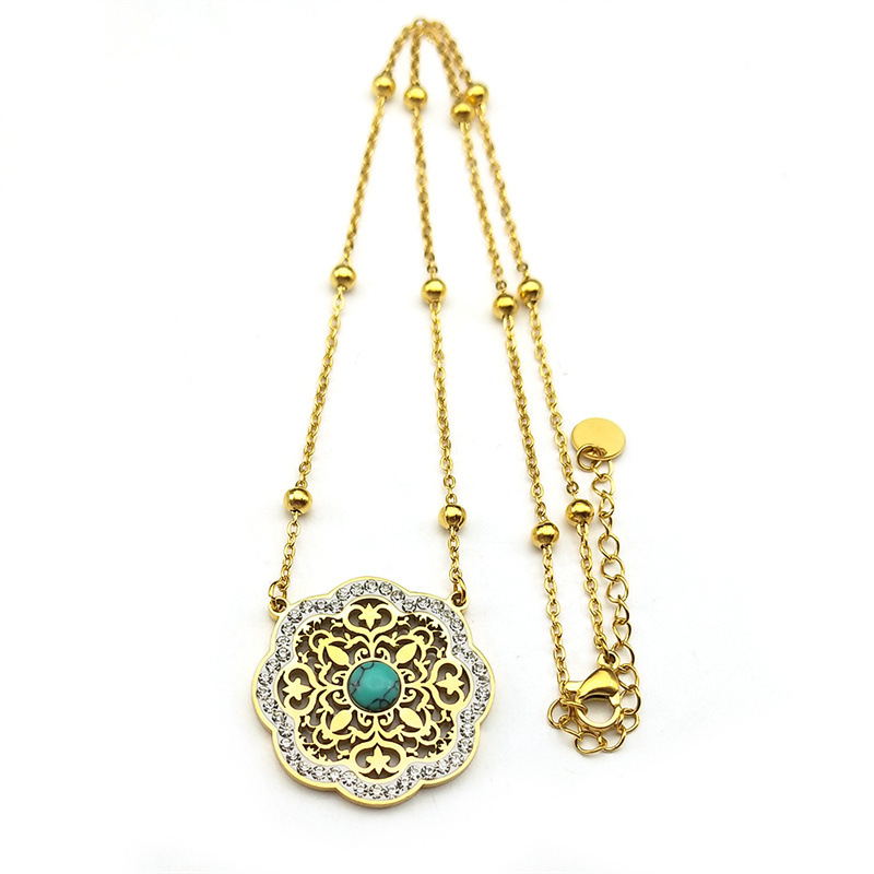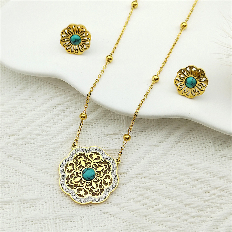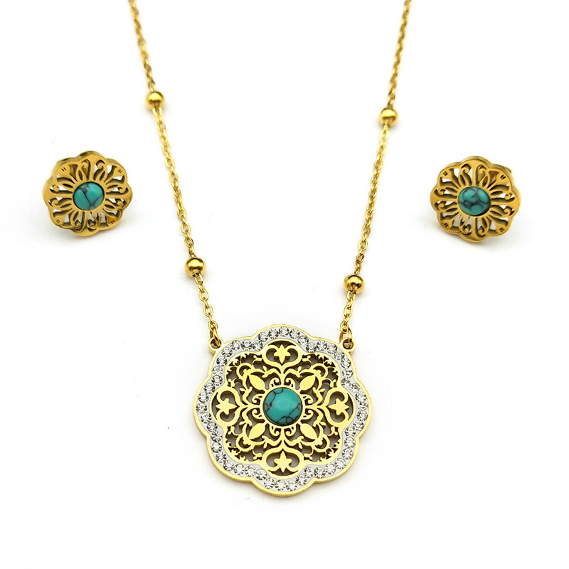 Rhinestone Stainless Steel Jewelry Set Stud Earring & necklace 304 Stainless Steel with Turquoise Flower plated 2 pieces & for woman & with rhinestone & hollow golden Sold By Set