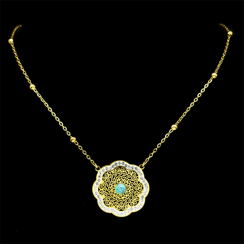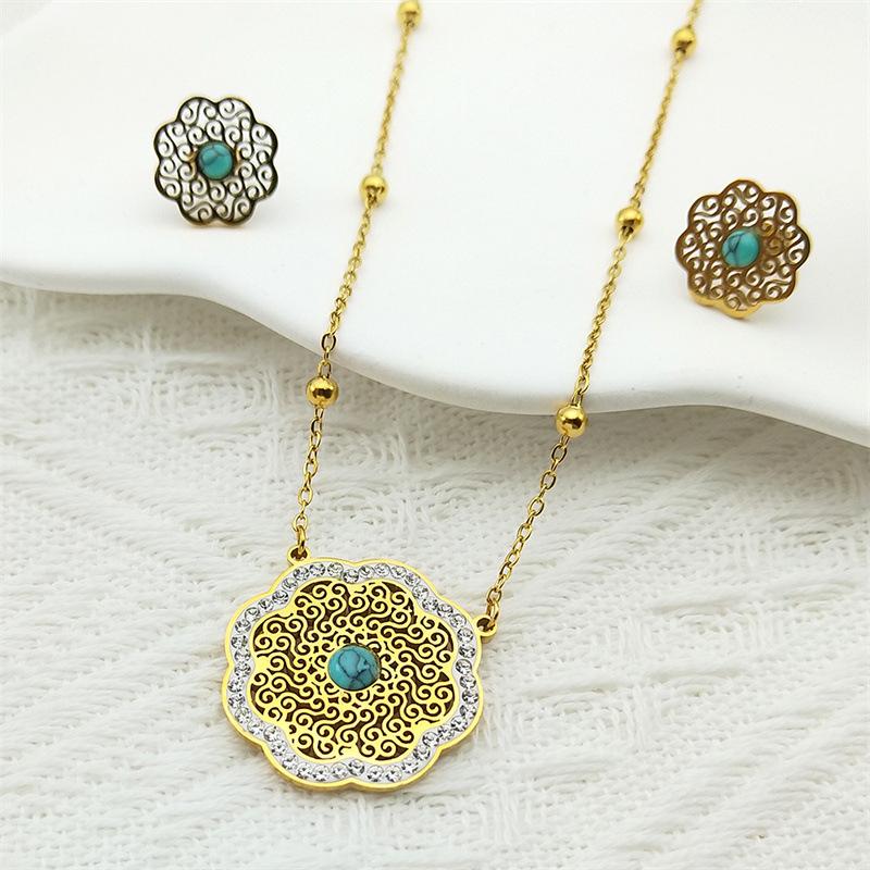 Rhinestone Stainless Steel Jewelry Set Stud Earring & necklace 304 Stainless Steel with Turquoise Flower plated 2 pieces & for woman & with rhinestone & hollow golden Sold By Set