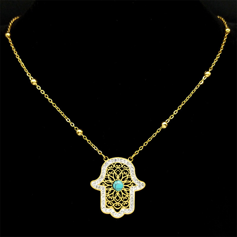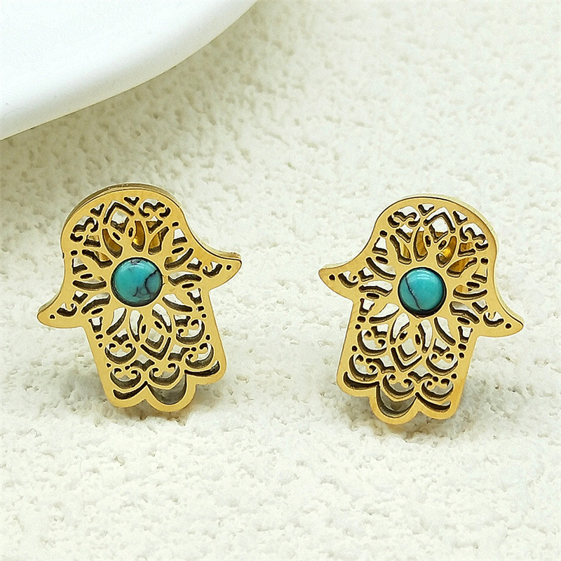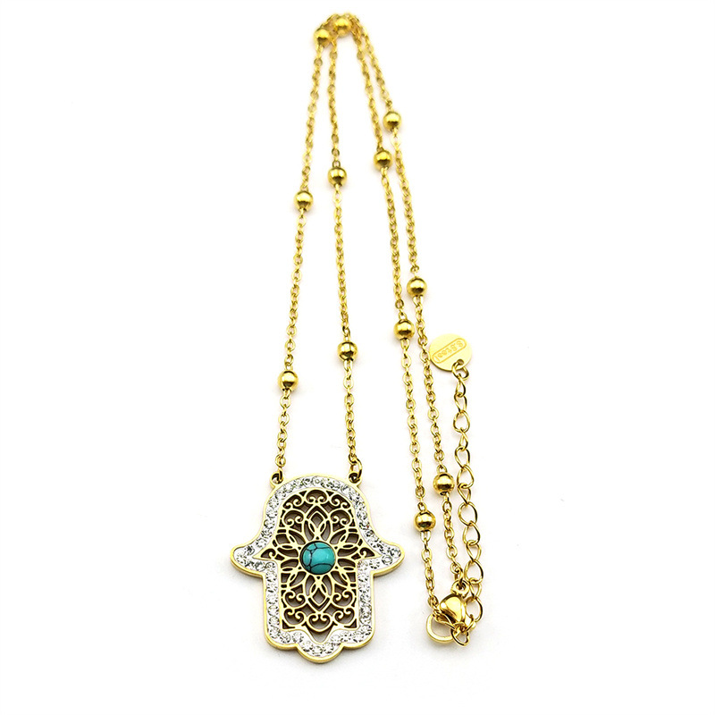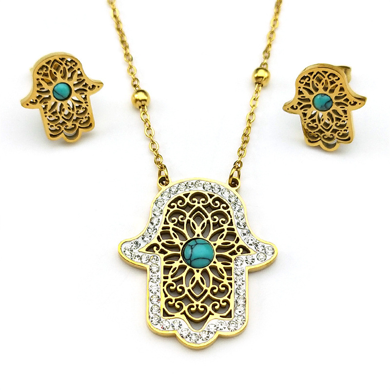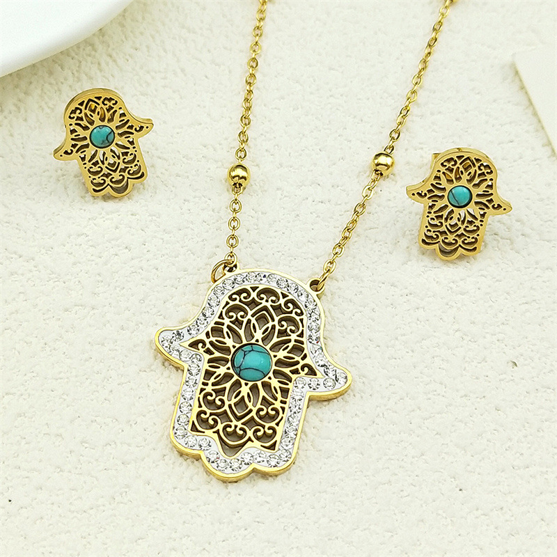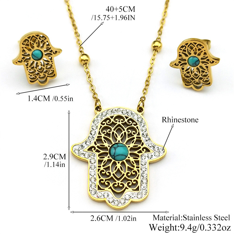 Rhinestone Stainless Steel Jewelry Set Stud Earring & necklace 304 Stainless Steel with Turquoise Hand plated 2 pieces & for woman & with rhinestone & hollow golden Sold By Set