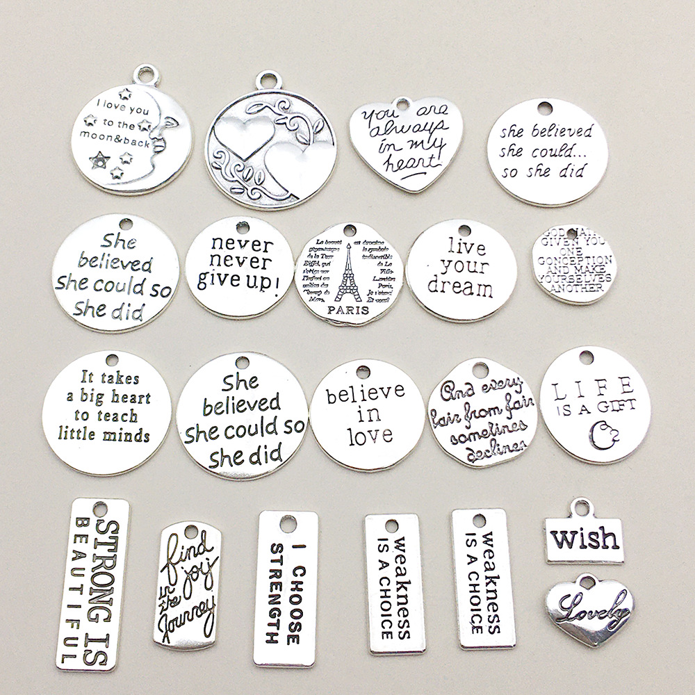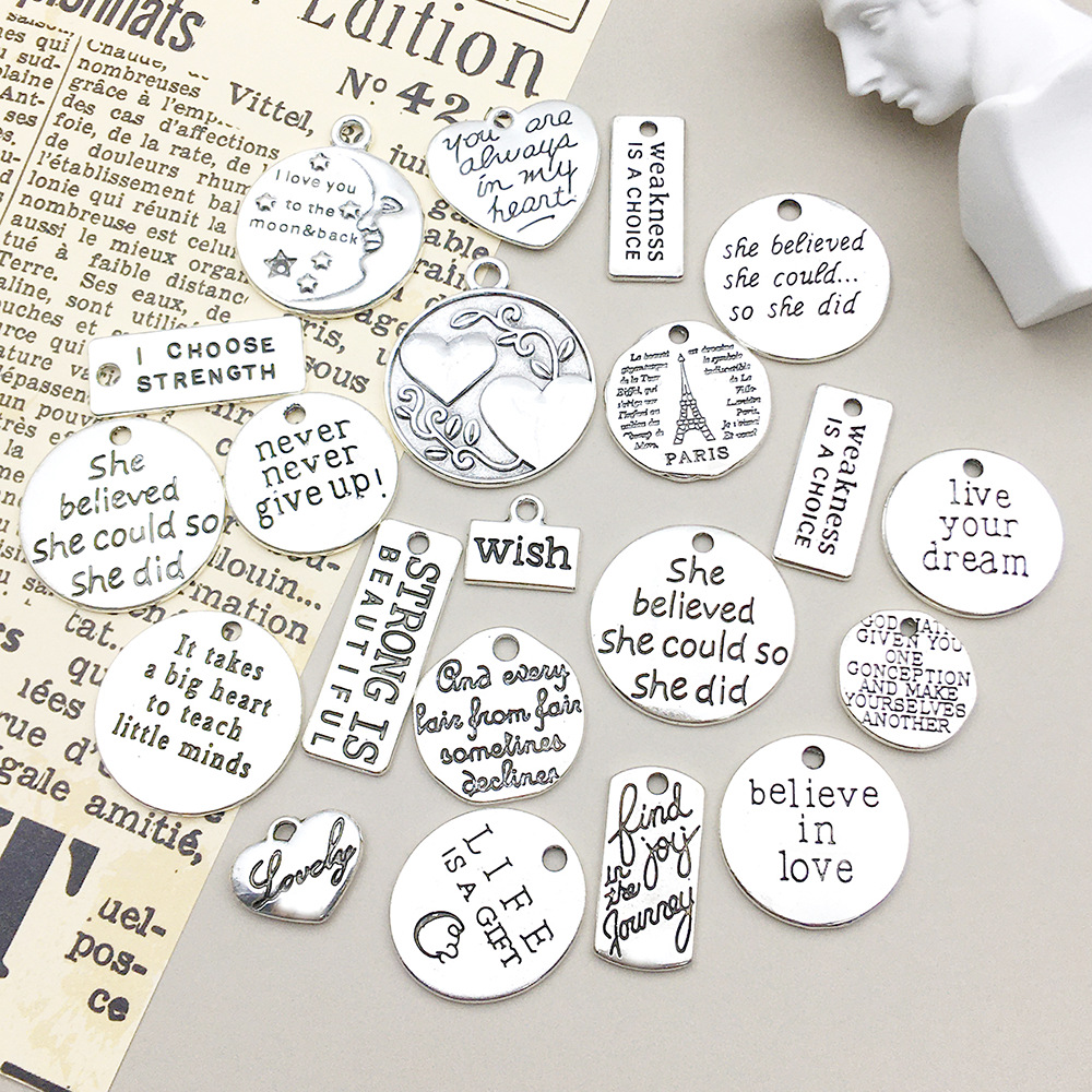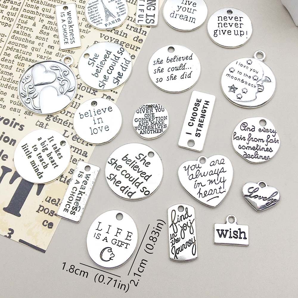 1:Mix 21pcs Ancient Silver Alphabet Cards -49.5 g-SN452:1 ancient silver round liveyourdream letter card 20*20mm-2.7g-24913:1 ancient silver round nevernevergiveup letter card 20*20mm-2.5g-24924:1 ancient silver round believeinlove letter card 20*20mm-2.6g-24935:1 ancient silver peach love-shaped youarealways letter card 20*21mm-2.8g-57286:1 ancient silver rectangular wish letter card 13*10mm-0.8g-69907:1 ancient silver kindjoy letter card 10*20mm-1.7g-89918:1 ancient silver ICHOOSESTRENGTH letter card 10*24mm-2.1g-89979:1 ancient silver strong letter card 10*27mm-1.7g-900610:1 ancient silver round shebelieved letter card 17*17mm-2.4g-924911:1 ancient silver weaknessisachoice letter card 10*27mm-1.5g-983412:1 ancient silver round iloveyou letter card 23*27mm-3.8g-1089613:1 ancient silver round andevery letter card 18*18mm-1.7g-1089914:1 ancient silver round iron tower paris letter card 19*19mm-2.5g-1090815:1 ancient silver round makeawish letter card 22*26mm-3.1g-1090916:1 ancient silver round givenyouonce letter card 14*15mm-1.5g-1091017:1 ancient silver heart-shaped lovely letter card 14*11mm-1.1g-1091118:1 ancient silver round tree lifeisagift letter card 18*20mm-2.4g-1091219:1 ancient silver round weareallmadhere letter card 24*28mm-2.2g-1091320:1 ancient silver round asister reverse love letter card 24*28mm-3.4g-1091421:1 ancient silver round ittakes letter card 22*22mm-2.9g-1091522:1 ancient silver round shebelieved letter card 22*22mm-3g-10916