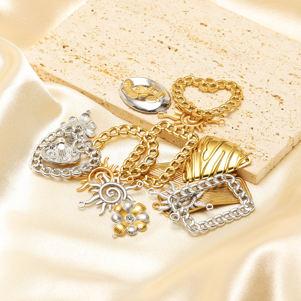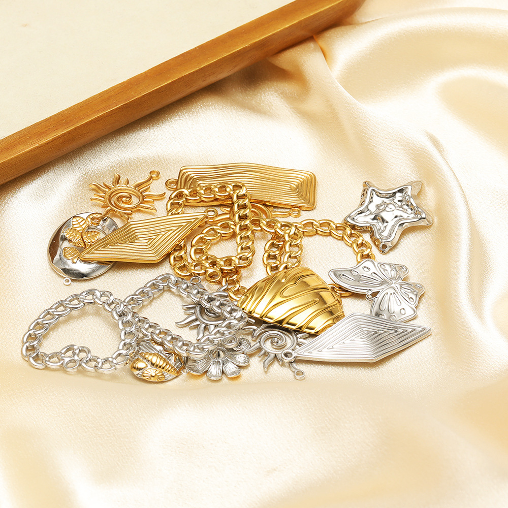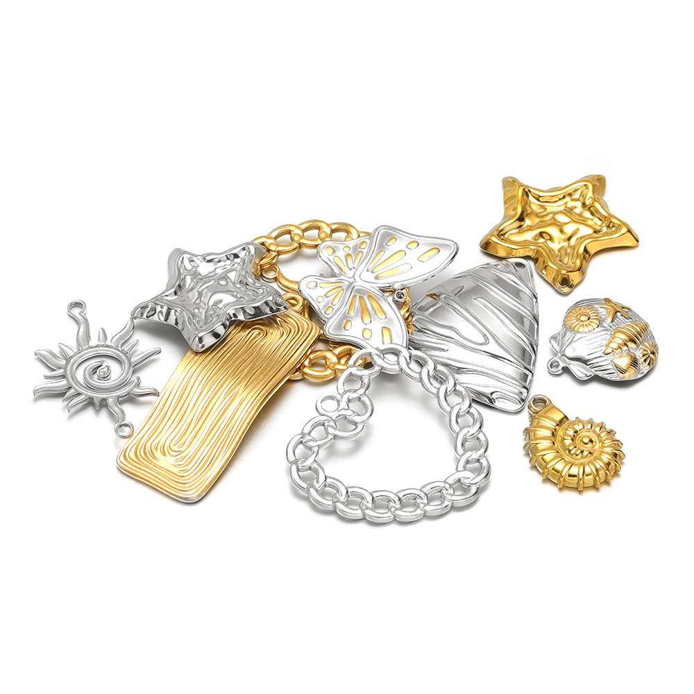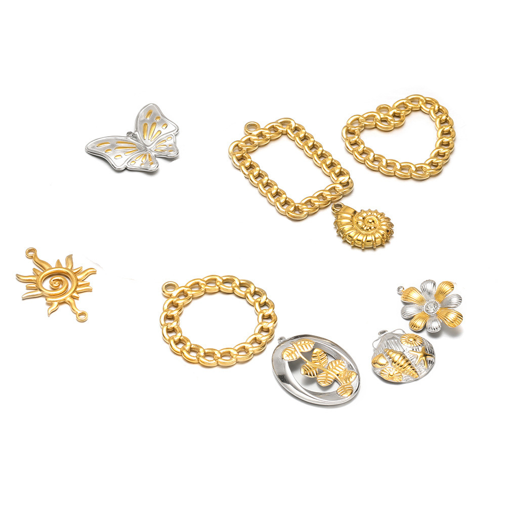 1:35*25mm hydraulic hollow sun, 2.2mm double hanging inside, gold2:35*25mm hydraulic hollow sun, 2.2mm double hanging inside, steel color3:21.5*20mm gold shell with 1.5mm single hole inside4:24.5*30mm gold butterfly, 1.4mm single hole inside5:33*23mm gold oval leaves, 1.2mm single hole inside6:26*19mm gold stripes flowers dotted with diamonds, 1.4mm single hole inside7:23*17mm hydraulic conch, 2.2mm single hole inside, gold8:23*17mm hydraulic conch, 2.2mm single hole inside, steel color16:40*36mm hydraulic hollow circle, 3mm single hole inside, gold17:34*37mm hydraulic hollow heart ring, 3mm single hole inside, gold18:43.5*28mm hydraulic hollow square ring, 3mm single hole inside, gold22:40*36mm hydraulic hollow circle, 3mm single hole inside, steel color23:34*37mm hydraulic hollow peach heart ring, 3mm single hole inside, steel color24:43.5*28mm hydraulic hollow square ring, 3mm single hole inside, steel color