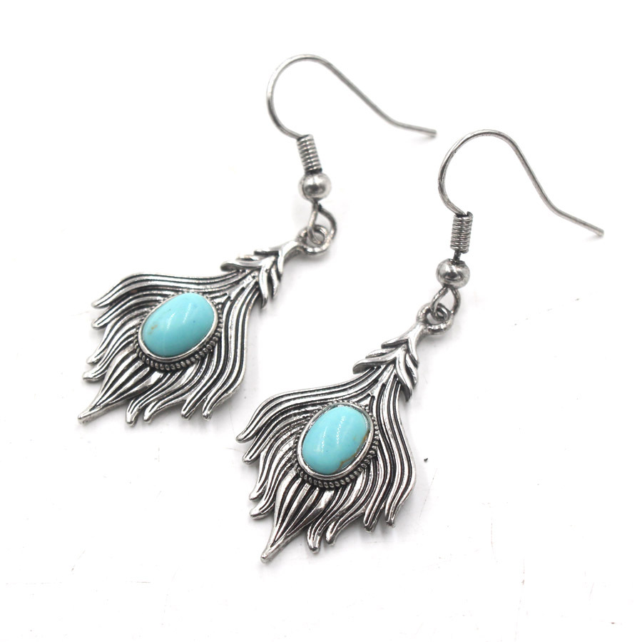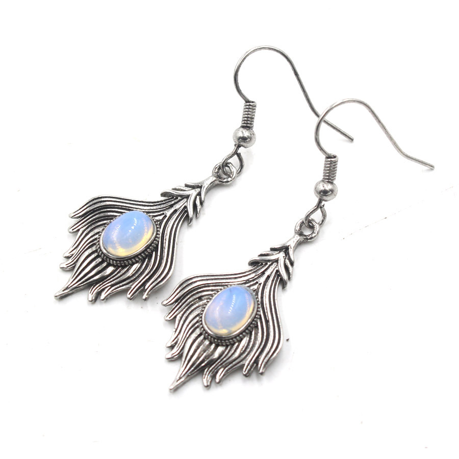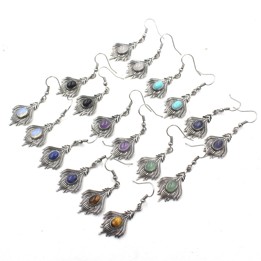 Brincos de gota de liga de zinco, with misto de pedras semi-preciosas, Forma de pena, banhado, joias de moda, Mais cores pare escolha, 17x31x5mm, vendido por par