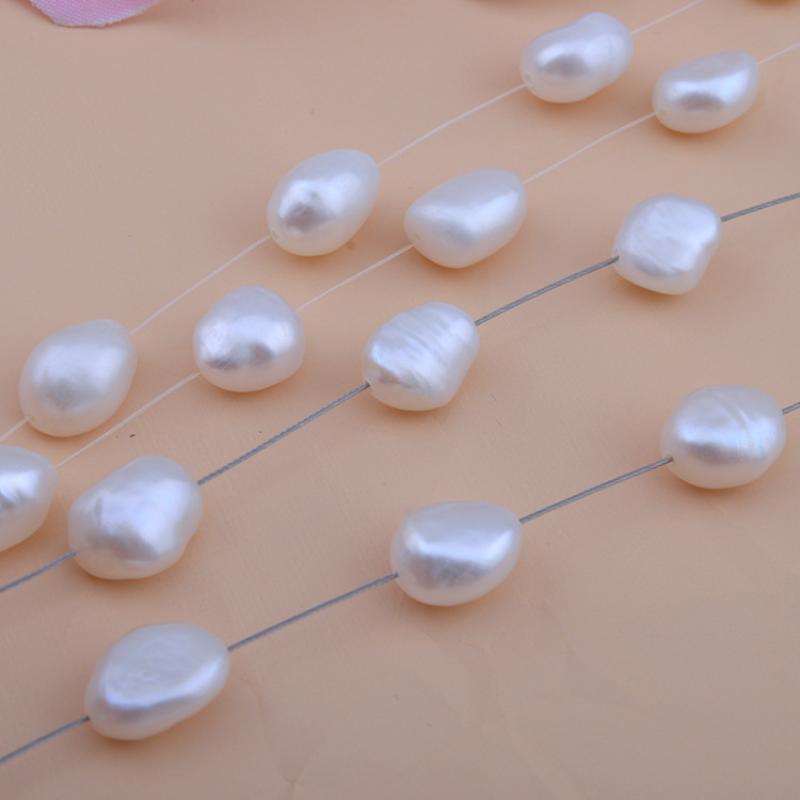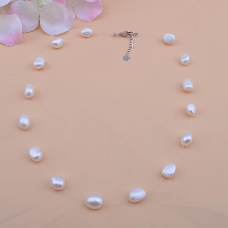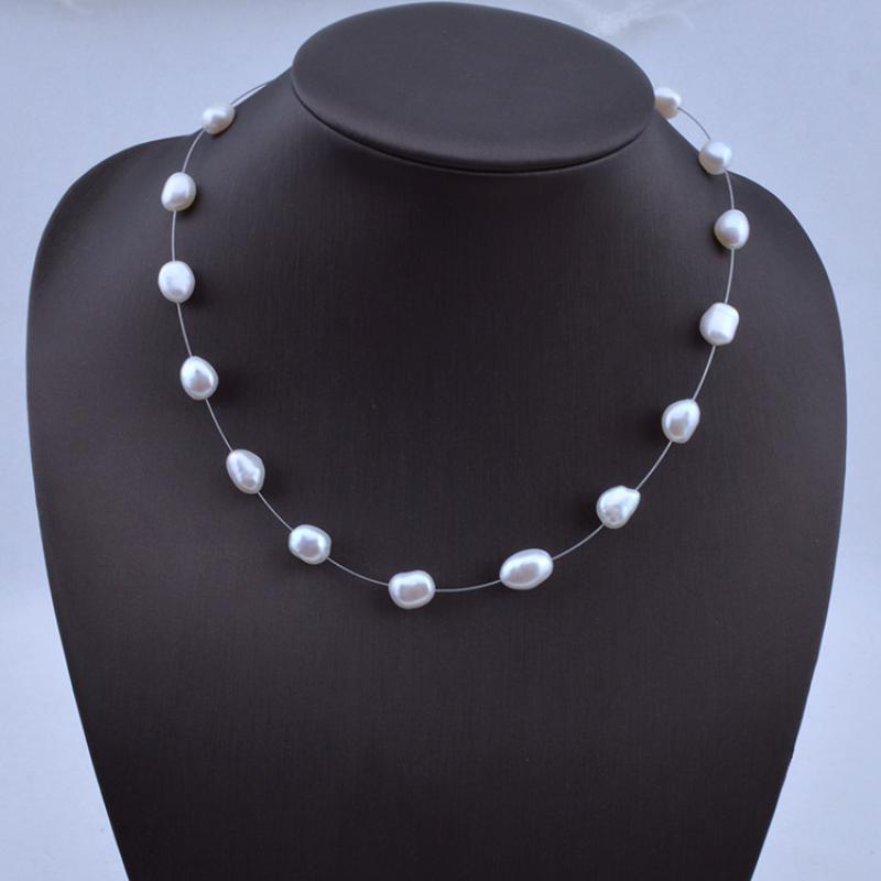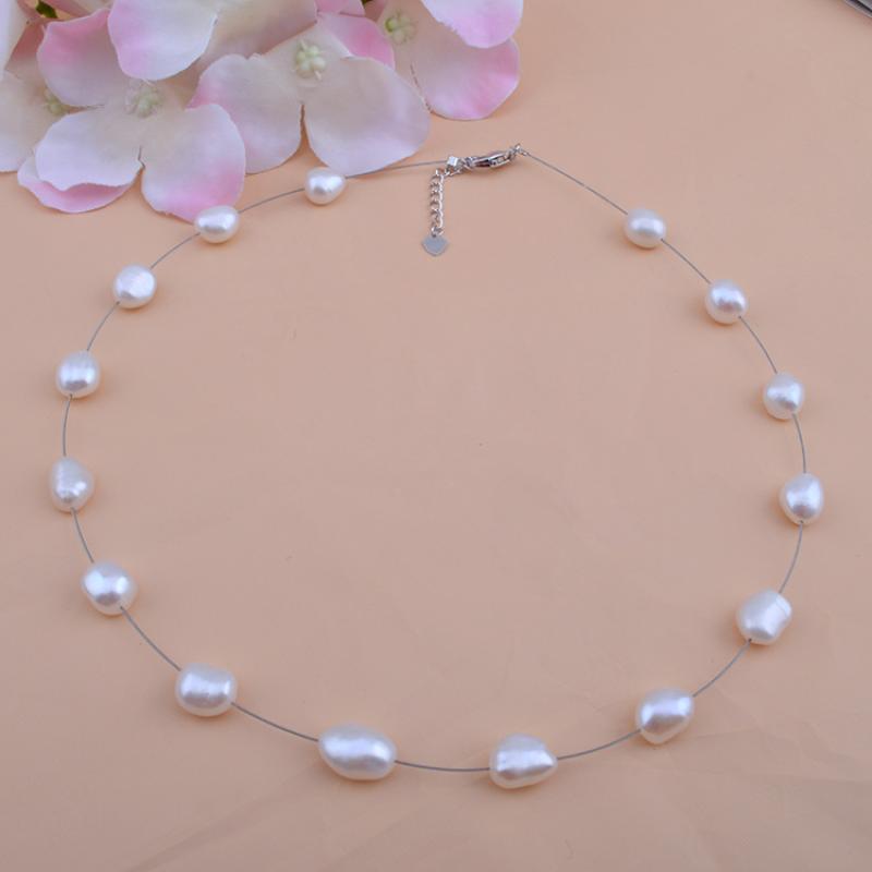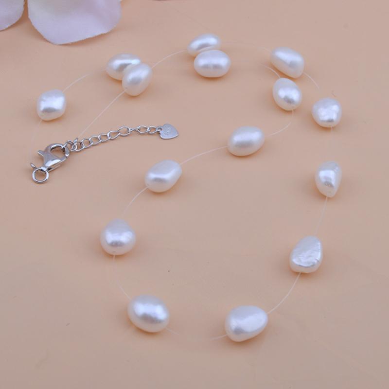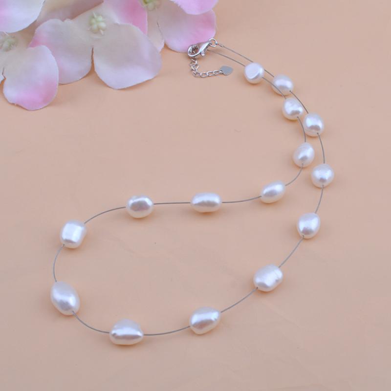 Colar de Pérolas de Água Doce Natural, Pérolas de água doce, with 925 de prata esterlina & fio de cauda de tigre, cromado de cor prateada, joias de moda, branco, 8x9mm, vendido por Strand