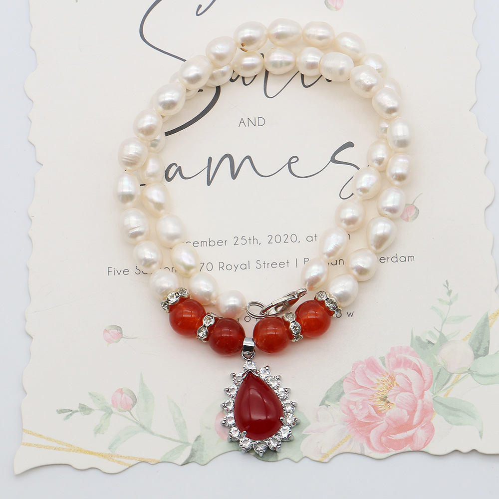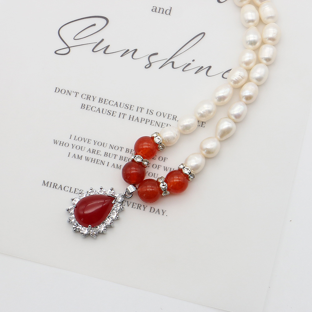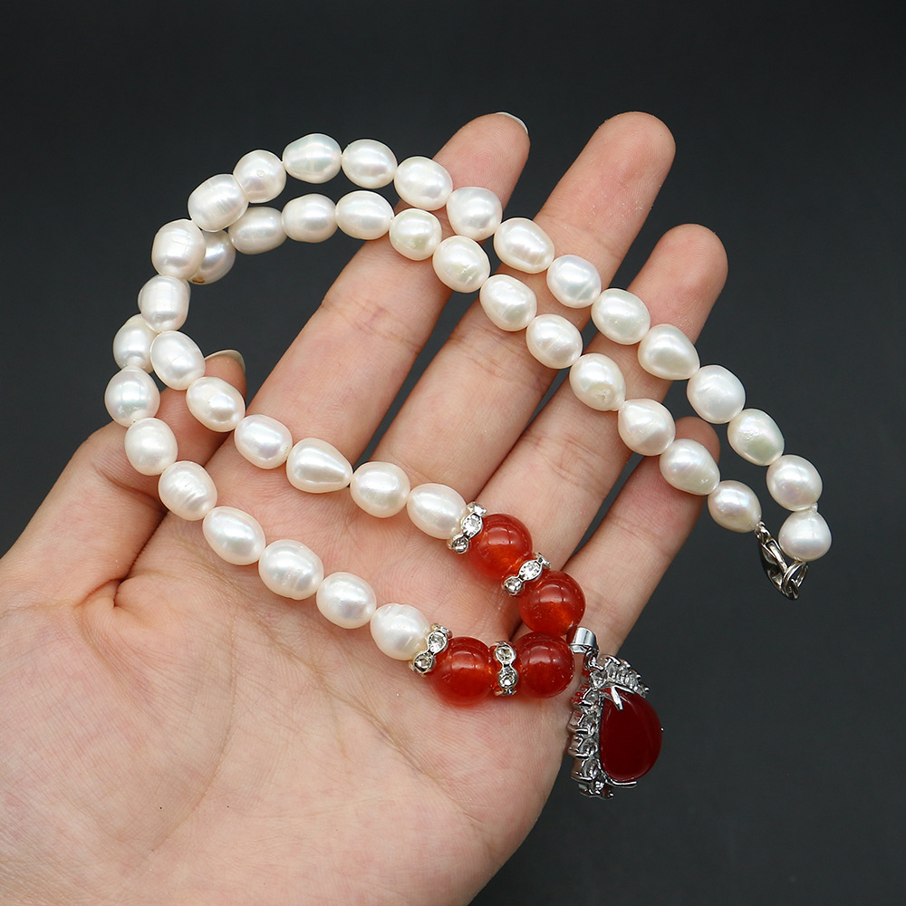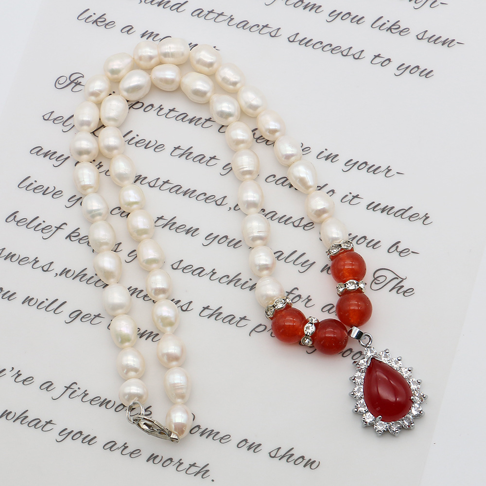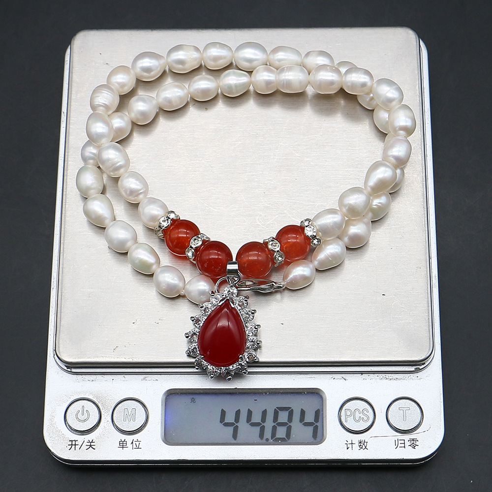 Colar de Pérolas de Água Doce Natural, Pérolas de água doce, with Ágata vermelha & Aço inoxidável 304 & liga de zinco, Arroz, joias de moda & micro pavimento em zircônia cúbica, cores misturadas, 8-9mm, vendido para 44 cm Strand